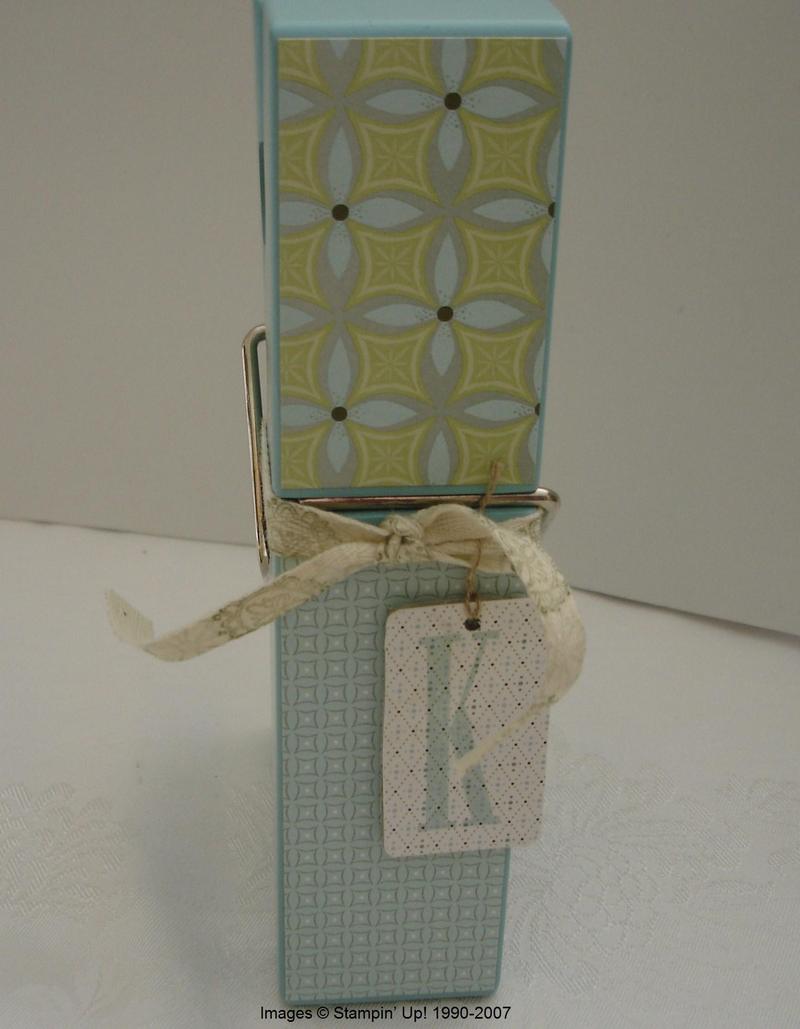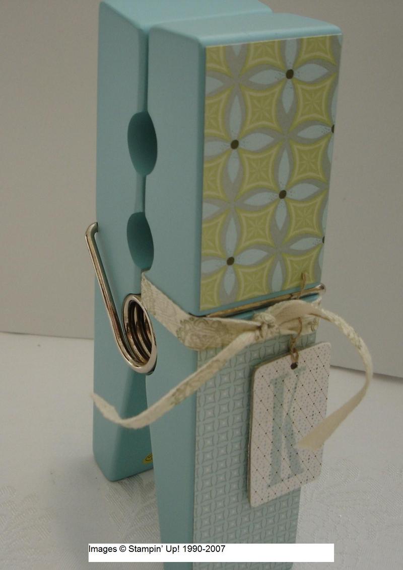 For two more gifts, I decided to use these jumbo clothespins that make great photo or memo holders…or just a decoration! I just applied some Wintergreen Designer Paper using my SU Anywhere Glue Sticks, stamped some Twill Tape to tie around and made little initial tags for the recipients using the retiring Letterpress Alphabet. I would have done a little more in the way of decorating but of course it was time to get the packages mailed or they wouldn’t even receive them by Christmas!