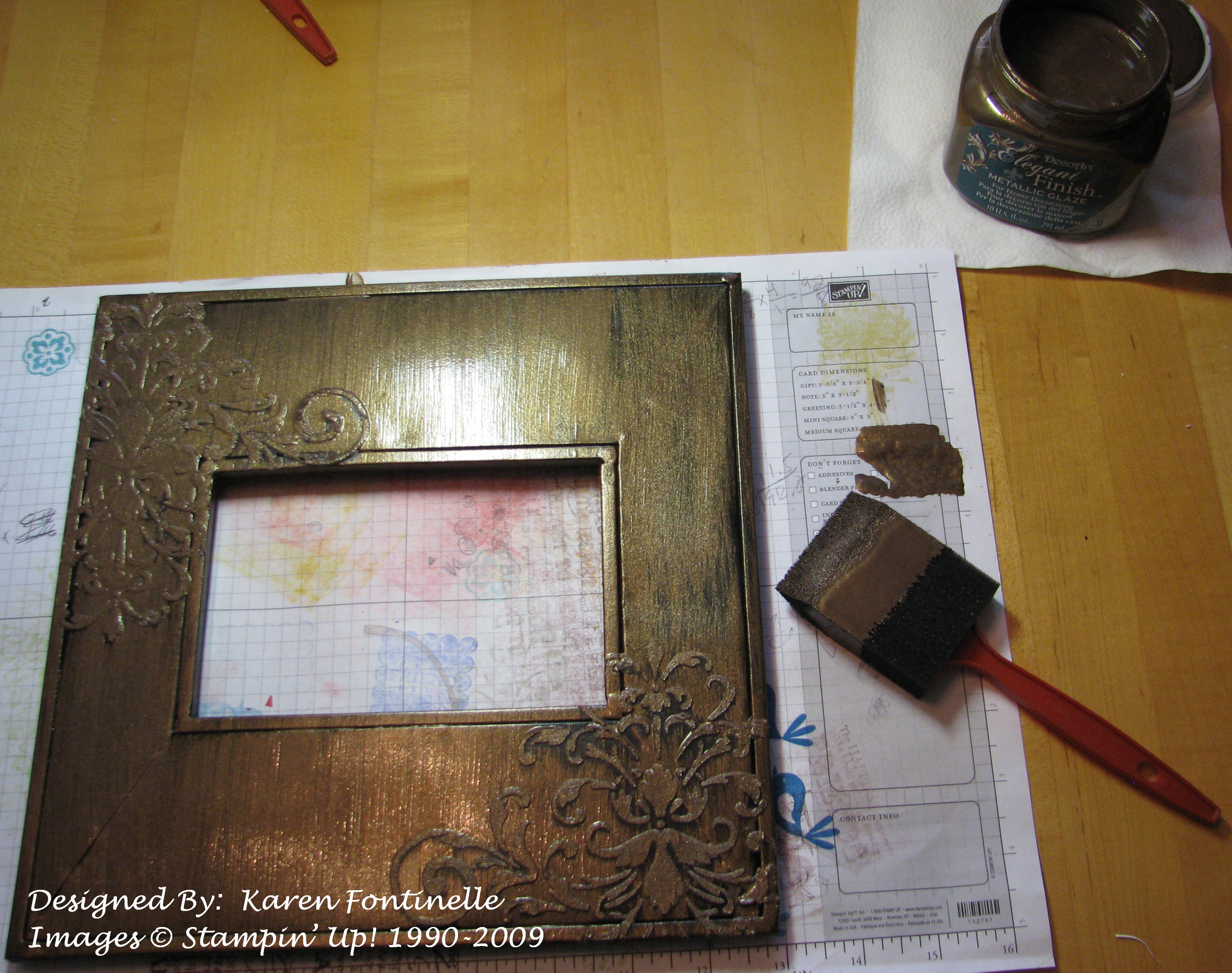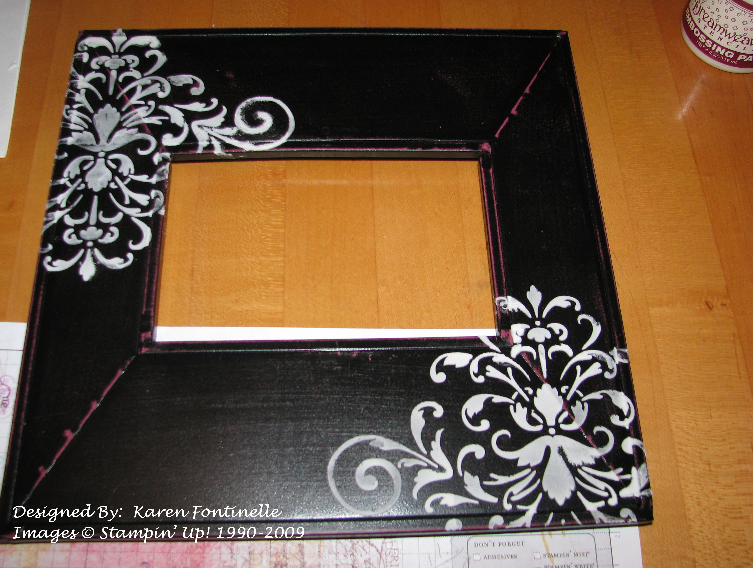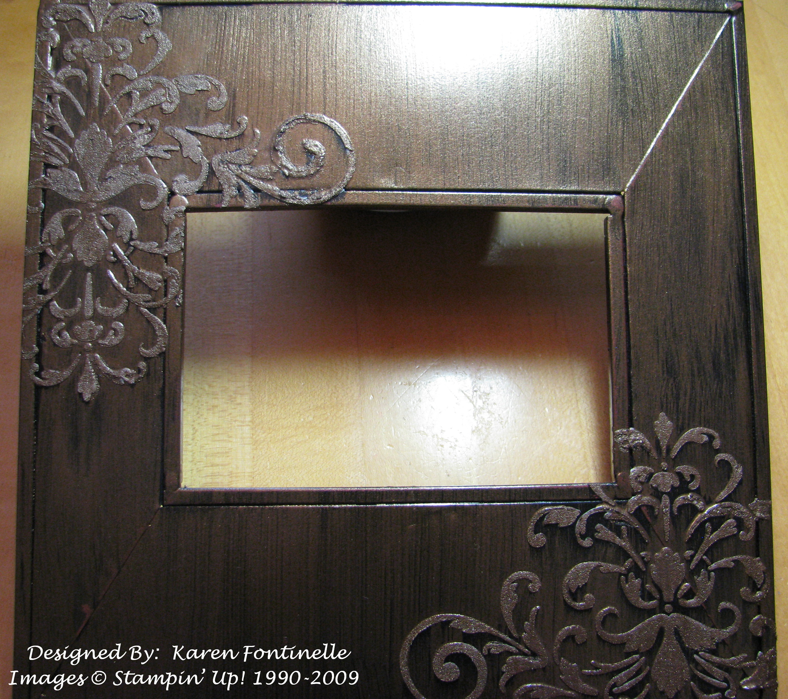 So let's back up…..I bought the metal frame, called "Craft Photo Frame" "Time to Decorate!" 4×6 inch. I had already purchased the Stampin' Up! "Kind Thoughts Brocade Stencil" in the Decor Elements line. Mine is the "Small" size but I think it worked just fine. I already had some "Dreamweaver Stencil Embossing Paste" (you can see it in the corner of the photo) from my pre-Stampin' Up! days and a palette knife. I placed the stencil where I wanted it on the frame, taped down two sides, and slathered on the embossing paste with the palette knife….just like frosting. Then I turned the palette knife on its side to scrape off the excess paste. Just lift the stencil up and you have your design on your project. Now be very sure not to let the paste dry on your stencil, so be ready to wash it off right away.