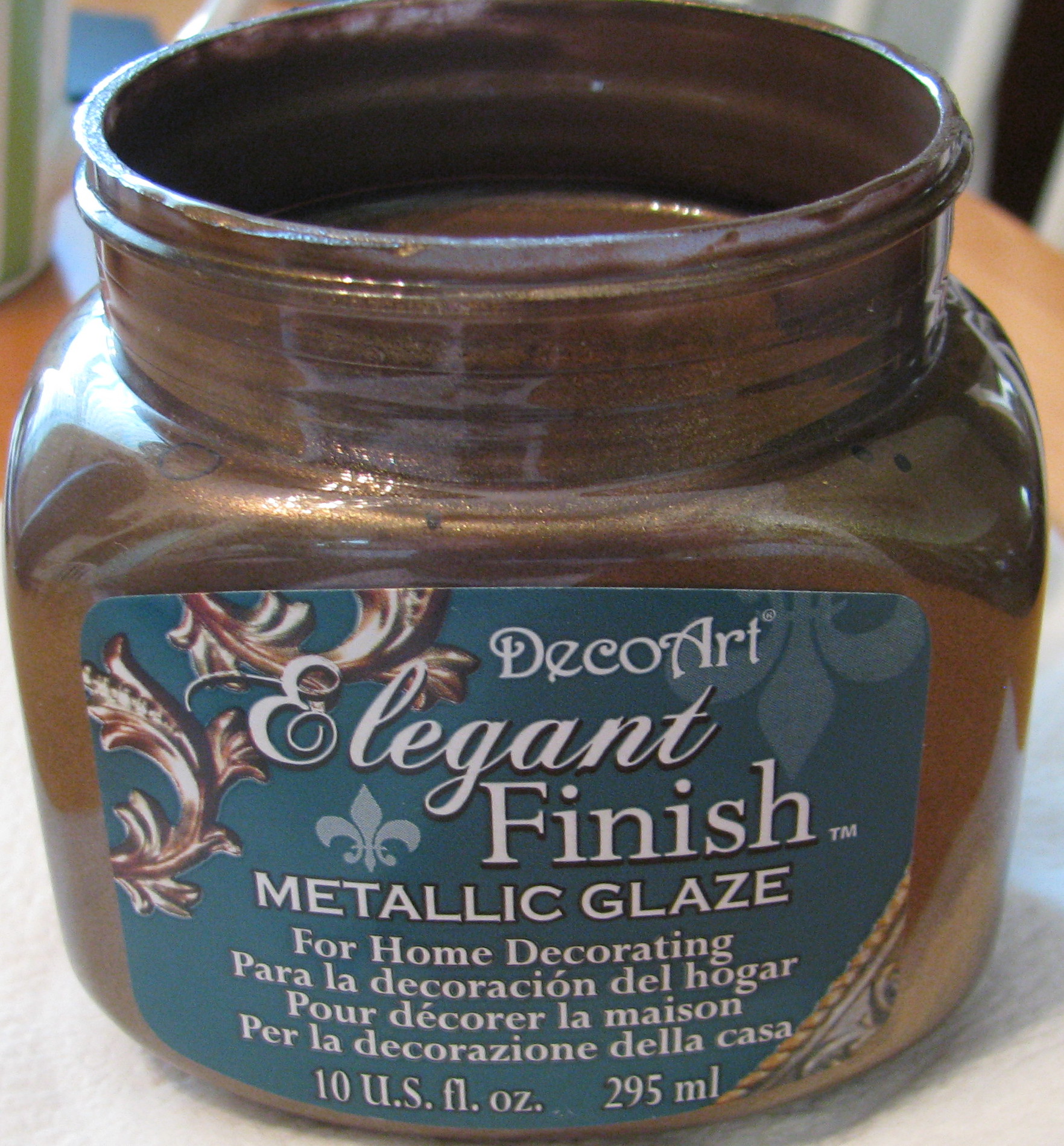 I let mine dry overnight since it was late anyway, but a couple hours should do it. This morning I used a foam brush to apply the "DecoArt Elegant Finish Metallic Glaze". Mine is the Renaissance Brown color. This step was SOOO easy. Just brush the glaze on rather lightly. You can go over it a little bit if you get too much on or not enough. You could probably even do a little wiping with a soft cloth if you want, but I wouldn't rub on the embossing too much.