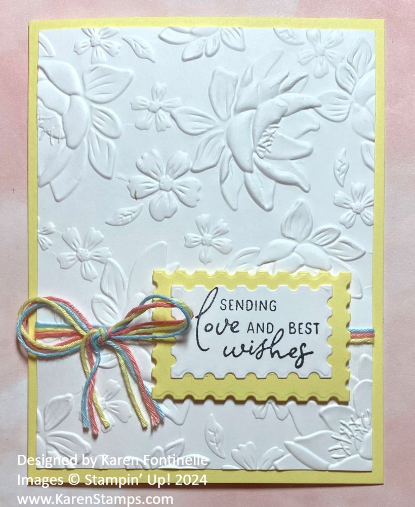 This Layered Florals Embossed Best Wishes Card isn’t at all what I had planned in my mind, but that’s how creativity goes sometimes! Once I embossed the white layer, I couldn’t possibly cover it up as much as I had originally planned! It was very pretty! Then I added a greeting and a little embellishment with some colored twine.