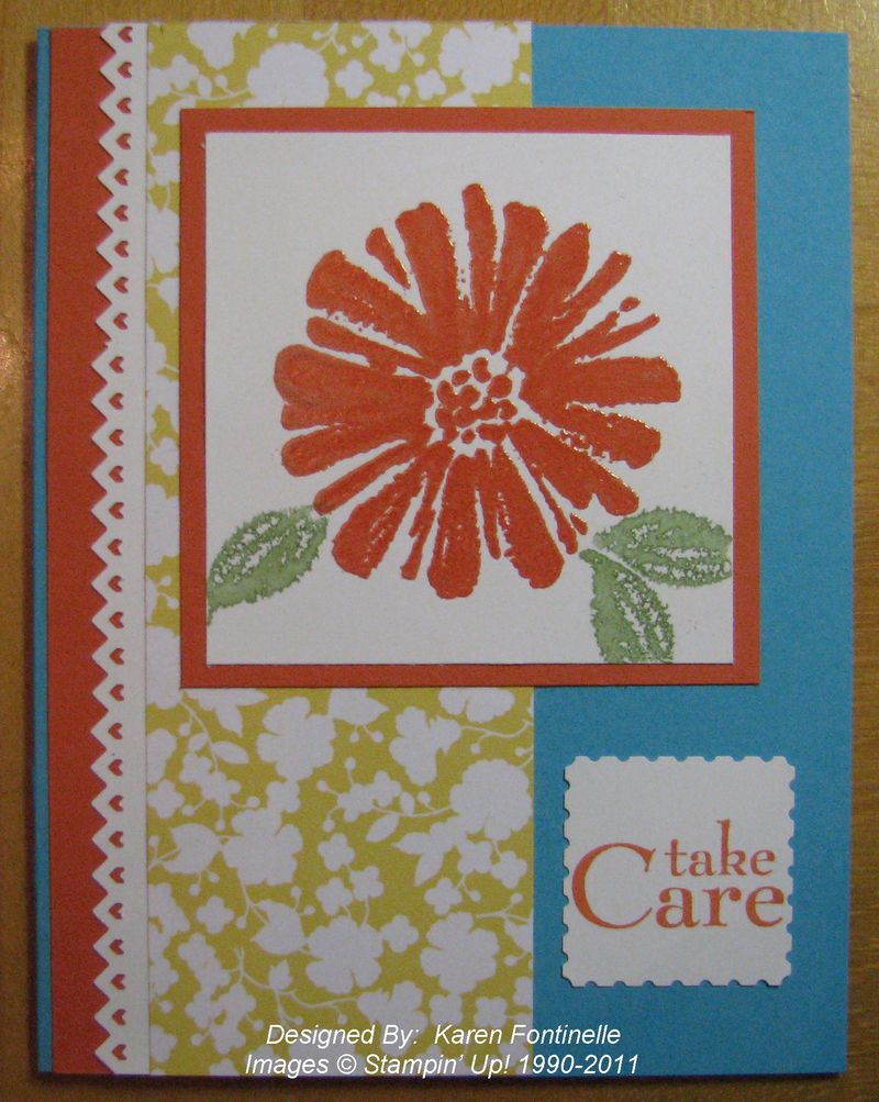 "Love & Care" is a Hostess stamp set in the Stampin' Up! Summer Mini Catalog on page 5. There are so many Stampin' Up! ideas on how to use this lovely stamp set! Once you start playing with it you can't stop! The flower is stamped with Versamark and them embossed with the new Tangerine Tango Stampin' Embossing Powder. Everyone loves these new bright colors for embossing! Check them out on page 23. The strip of designer paper is from mini catalog, Beyond the Garden. These colored flowers will definitely brighten your day! And you've got to have the new Postage Stamp Punch #122344 that I used for my greeting. I forgot to take a photo, but I also stamped a piece of Whisper White card stock on the inside and LOVE how pretty it turned out with some of the other flower stamps on the corners!