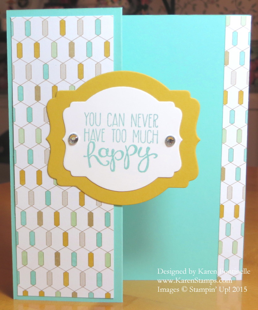 I think this is called a Z-Fold card! It uses the Lullaby Designer Series Paper, which is on the Stampin’ Up! Weekly Deals this week. In spite of the name, you won’t find anything “baby” about it on any of the patterns unless you could little tiny hearts. If you like the colors – Baked Brown Sugar, Coastal Cabana, Crisp Cantaloupe, Hello Honey, Pistachio Pudding, Whisper White – then you should get it! Don’t pass it up because it is called “Lullaby”. But it is also soft and pretty for any baby projects! So very versatile.
