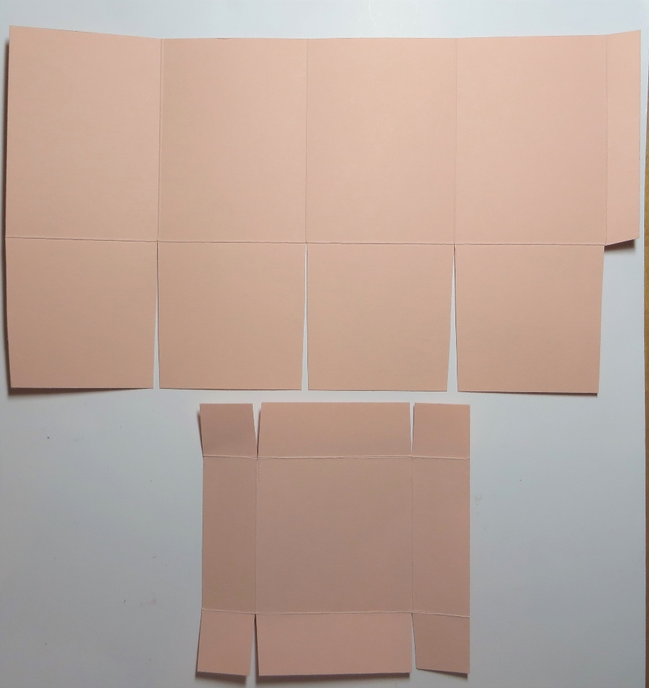 Cut a piece of cardstock 10 1/2″ x 6″. Scoring across the paper in landscape position, score at 2 1/2″, 5″, 7 1/2″, and 10″. Turn the paper to portrait position (narrow edge, up and down), score at 2 1/2″ to form the bottom flaps of the box.