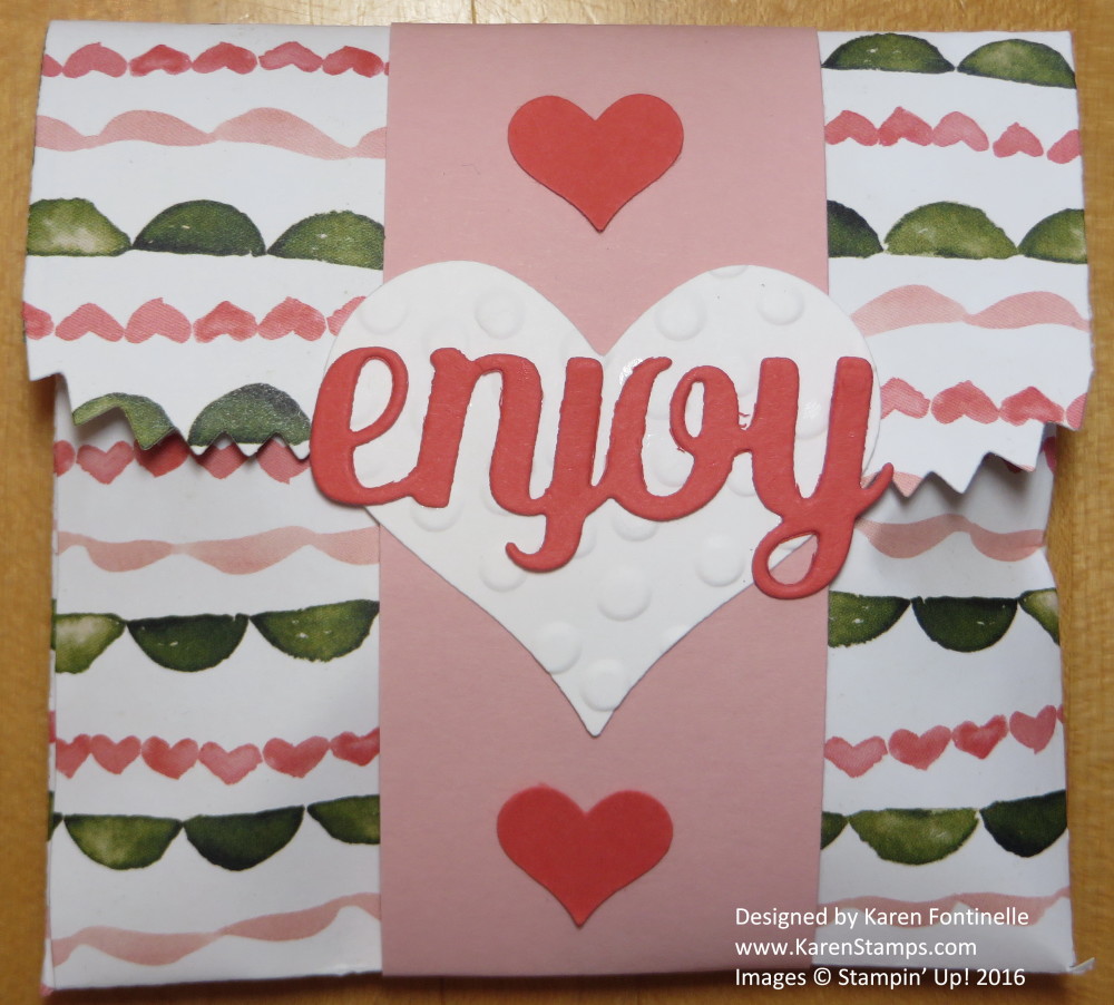 I’m back to one of my favorite projects, using the Mini Treat Bag Thinlits Dies to make a special treat bag with the Birthday Bouquet Designer Series Paper. I love using the Mini Treat Bag Thinlits Dies for lots of projects! The basic way to use the dies is to make a treat bag with an opening in the top like any little sack and then embellish it. But this one I folded the top over and added a belly band to hold it closed. It is filled with two chocolates and a tea bag. The die cut heart also comes in the die collection. I embossed the heart with the Decorative Dots Embossing Folder just to add a little texture. The small hearts are punched with the heart punch in the Itty Bitty Accents Punch Pack. The word “Enjoy” is also one of the die cuts. You really get a lot in the Mini Treat Bag Thinlits Dies! The belly band is 8 1/2″ x 1 1/2″ and just folded around the bag. The bag is scored at 3 1/2″ from the bottom if you want a score line to help fold the top over.