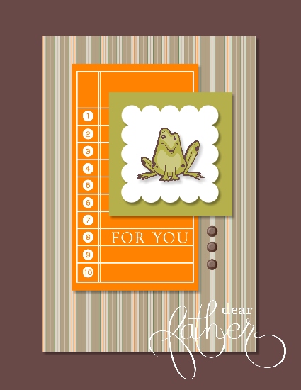I changed the designer paper to the striped "Travel Journal" paper, recently released from Stampin' Up! The frog looked cute for a Father's Day card and the orange layer was there as well. I changed the brads to Chocolate Chip ones and added the sentiment.