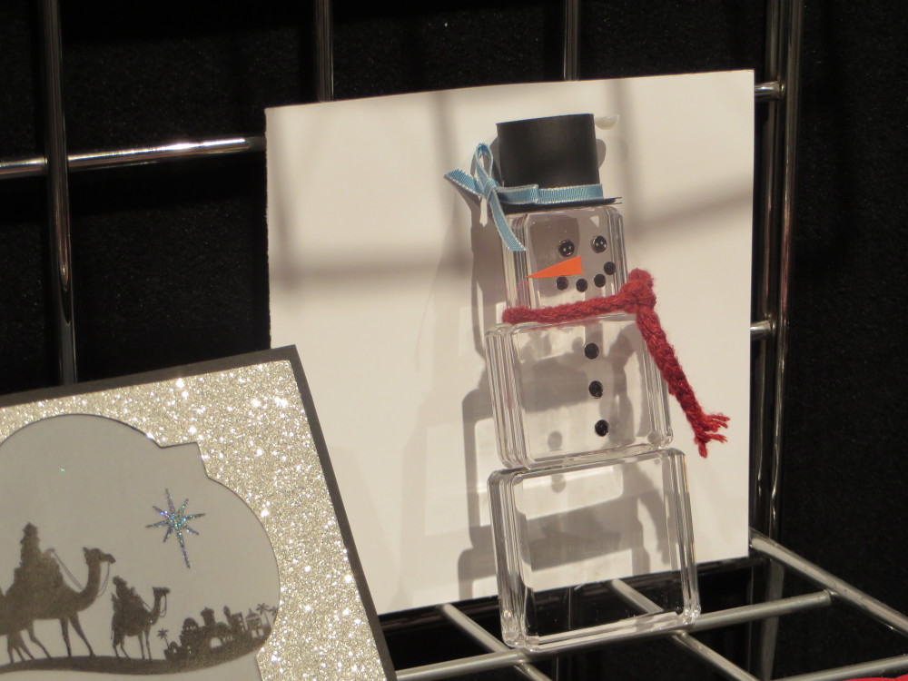 Out of the many things on display at the Stampin’ Up! Convention, here is one I thought was so cute! Use three clear blocks to build a snowman! Then dress him up how you like! Christmas isn’t that far off, especially for us crafters. Always good to start collecting some good ideas early!