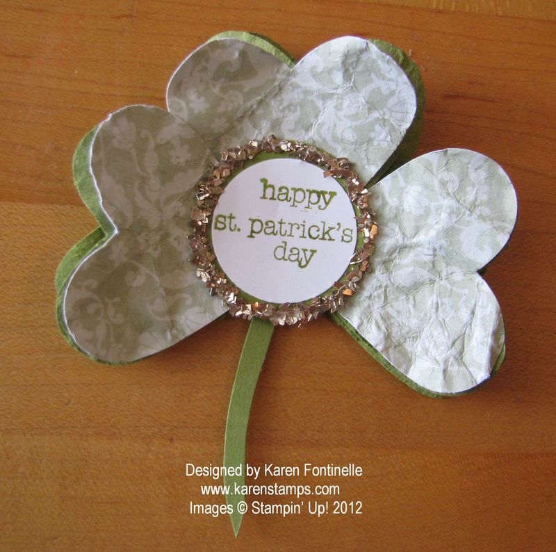 If you want to make a St. Patrick's Day pin to wear on St. Patrick's Day March 17th, just get out your Full Heart Punch and some paper! I punched six hearts out of Old Olive card stock and three out of green designer paper and glued them onto a circle of Old Olive on the back. The stem is just hand cut. To jazz it up a little and add a greeting, I used the stamp from Teeny Tiny Wishes (talk about a versatile stamp set!!) and inked up the words separately with a Stampin' Write Marker, punched it out with the 1" Circle Punch and then a 1 1/4" Circle Punch layer of Old Olive. But for a little bling, I added some Champagne Gold Glass Glitter around the edge. Put a pin on the back from the craft store and you're good to go with some green to wear on St. Pat's.