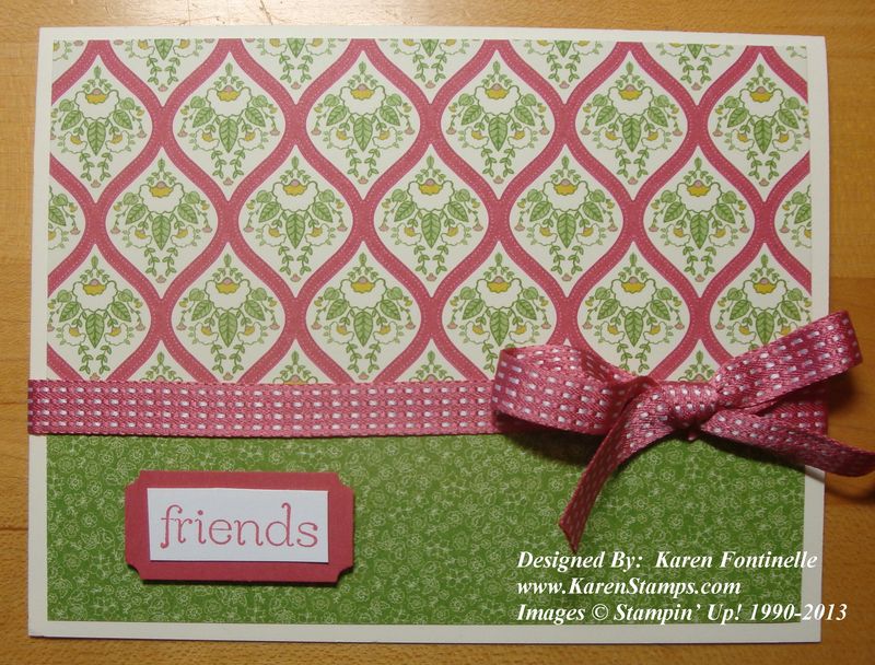 For a little greeting, I stamped the word "friends" from the stamp set Sweet Essentials and layered it on the Ticket Duo Punch #126883. You could use any greeting and any coordinating punch and you have an easy to make card for any occasion!