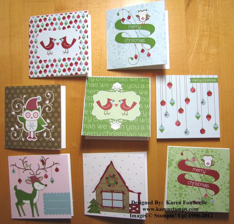 Did you know that the Snow Festival Designer Series Paper #126908 in the Holiday Catalog has a sheet that looks like this in the package? I think the first thing everyone thought when they saw it was "gift tags"! Just cut the whole page apart into the individual 3"x3" squares and mount on 3"x3" Whisper White cards (3" x 6" folded in half).