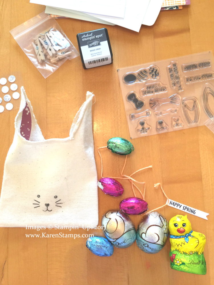 The little cloth bags were ready to be stamped with a bunny face, and the kit even included an adhesive dot with which to stick the little pom pom for the bunny tail on the back of the bag! So cute! Ears with adhesive on the back were included to stick inside the flaps of the bag. I stamped the little tag and attached to the bag with the tiny clothespin. All so easy! All I had to do was add some chocolate treats inside the bag and tie with a 12″ piece of the included baker’s twine. My little favor was ready to go in just a couple of minutes, if that long!