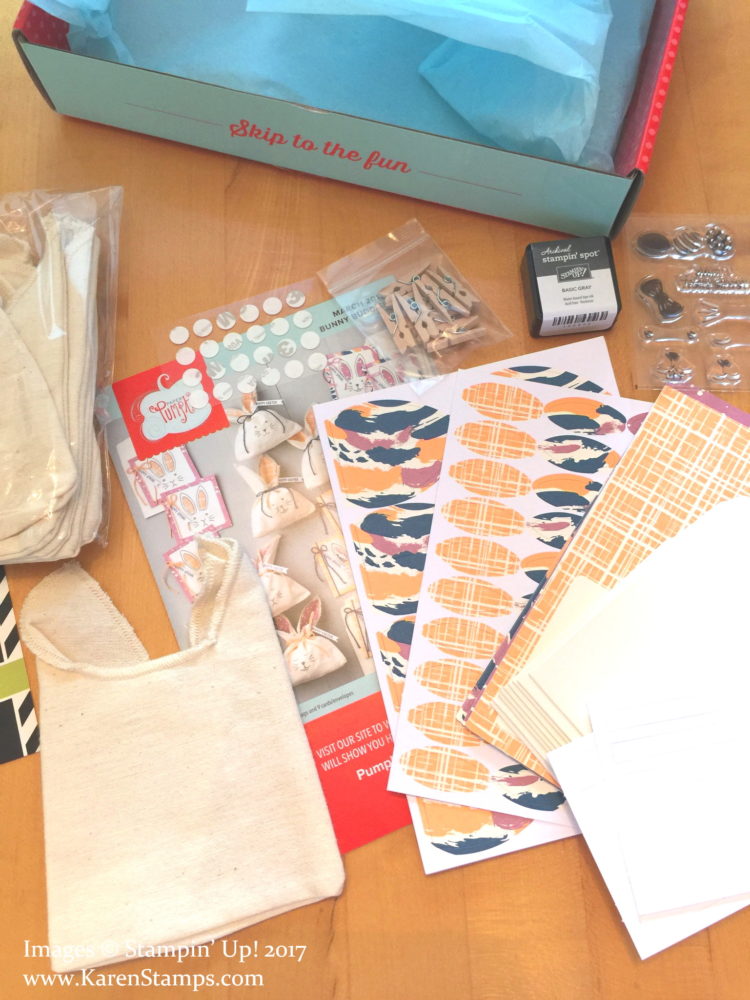 I finally opened my March 2017 Paper Pumpkin Kit from Stampin’ Up! and within minutes had made this cute bunny favor for spring. I wanted to take something to my friend who was in town when we met for dinner and I thought of this little bunny bag that would be perfect and something different than cards. All I had to do was open the Paper Pumpkin box and everything I needed was in there except a pair of scissors to snip the baker’s twine! Everything! Well, except the chocolate candy!