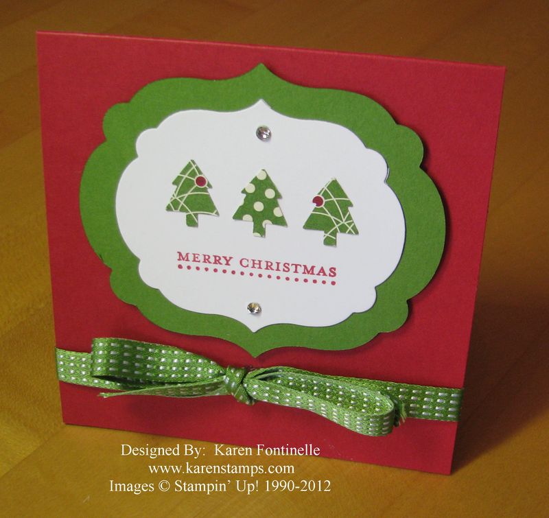 Here is my Merry Minis Teeny Tiny Wishes Christmas Card! Cute name, cute card….if I do say so myself! This is a 4" x 4" square card of Real Red that I just pulled out of my package of card stock scraps and decided to use it. I wanted to emphasize the Gumball Green 3/8" Stitched Satin Ribbon because tomorrow, Sunday September 30th, is the LAST DAY for the "Back to Spool" Promotion by Stampin' Up! With a $40 purchase of Stampin' Up! product from my store, you can choose a free roll of this ribbon, in any of the 5 colors. These are the current In Colors so you will love them!