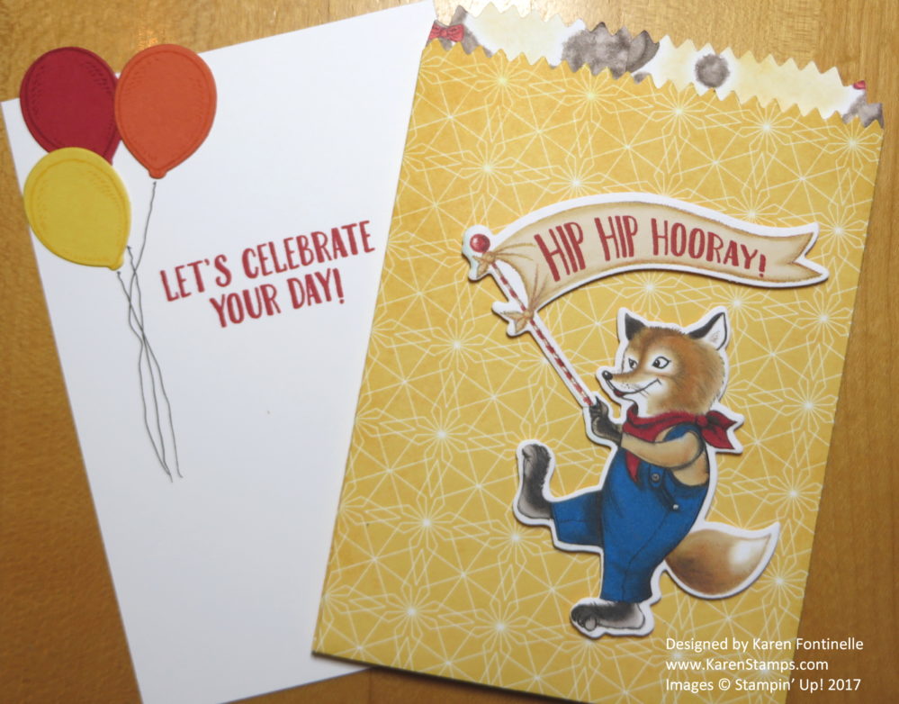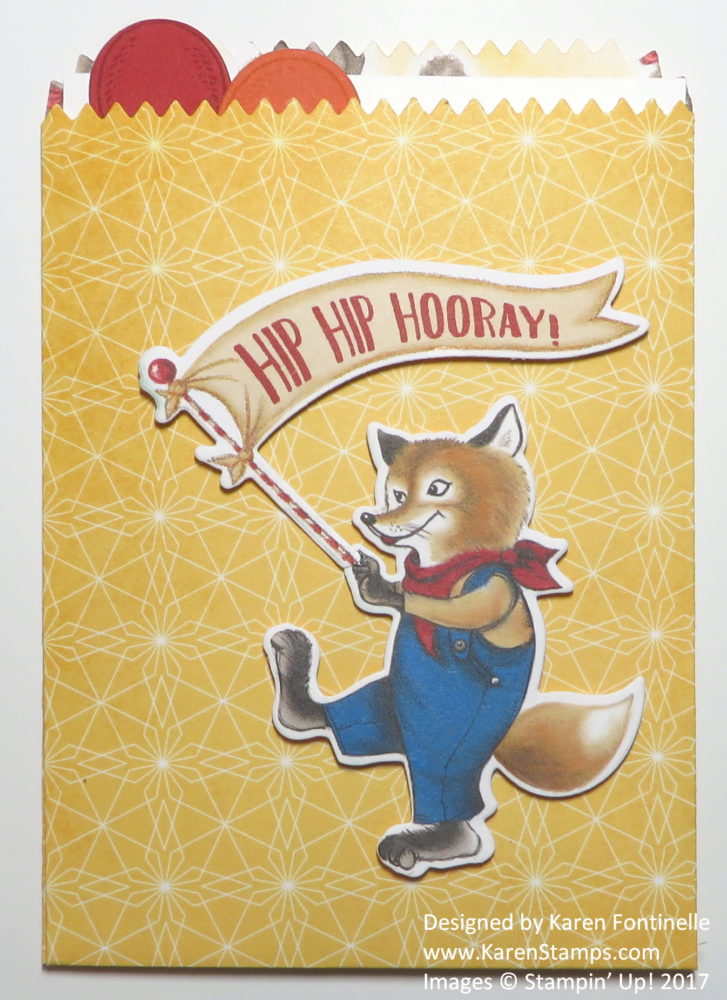 What’s even better is that there are die cuts that match the designer paper! The Birthday Friends Framelits Dies will cut out several of the images in the paper, like this foxy guy and his banner! I also stamped on the banner with the coordinating stamp set, Birthday Delivery Photopolymer Stamp Set. Lots of cute images in the stamp set as well. If you want to save 10%, get the Birthday Delivery Photopolymer Bundle that has the stamp set and framelit dies together. You WILL want both!