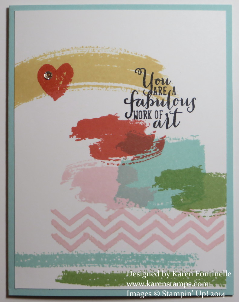 Tap into your modern artist with the Work of Art stamp set, a new one in the new Stampin’ Up! Annual Catalog! Since there’s no rhyme or reason to stamping with this set, you can just get out your paper, ink and stamps and play! Pick a few colors and go for it! I chose several ink colors from the Subtles family. The colors I used were Pink Pirouette, Wild Wasabi, Pool Party, Calypso CoraI, and So Saffron. I had no particular plan, just stamped. Very quick and very relaxing! The greeting comes in the set and I really love it! I think this stamp set is going to get a lot of use!