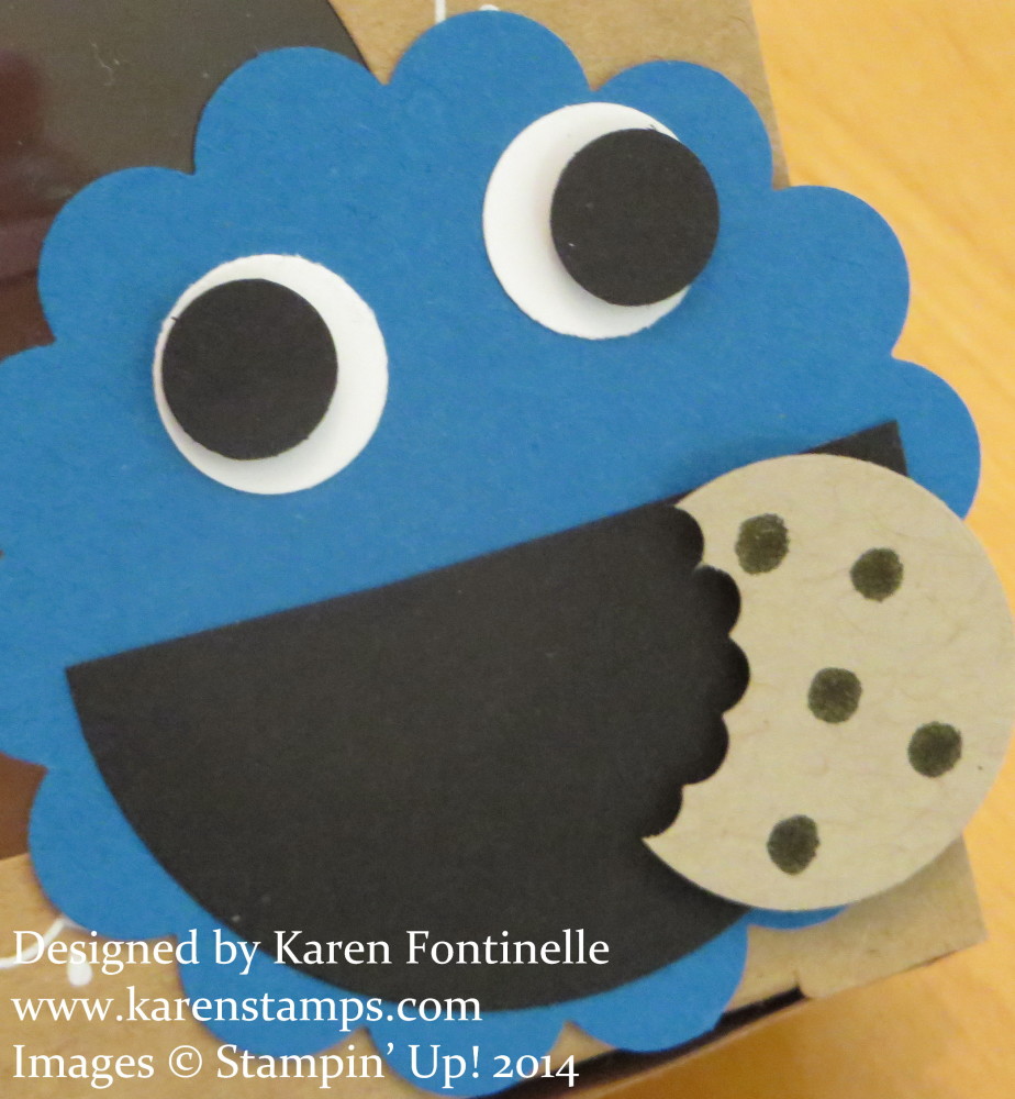 And who would celebrate this day more than anyone but Cookie Monster! If you have baked some chocolate chip cookies as a gift for someone, you could put a few in this Stampin’ Up! Decorative WIndow Gift Box and decorate the box with a cute punch art Cookie Monster! He’s so fun and easy to make and you can vary the size or even make him into a card. For this box, I punched his face with the 2 3/8″ Scallop Circle Punch. His mouth is die-cut with a 2″ Circle Framelit and then part cut off to look like a mouth. His eyes are punched with the 1/2″ Circle Punch and the circle in the Itty BItty Punch Pack. The all important cookie is punched with the 1″ Circle Punch and the eaten part punched out with the 7/8″ Scallop Punch. I just colored in the chocolate chips with the Early Espresso Stampin’ Write Marker rather than deal with glueing tiny dots! You can use Stampin’ Dimensionals to pop up certain parts or the whole Cookie Monster face.