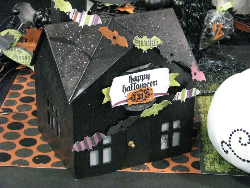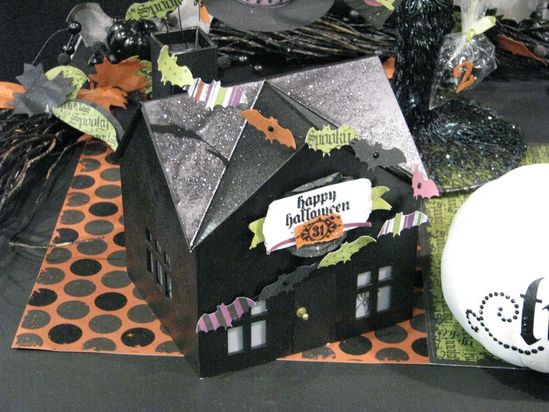 Spray paint the house and sprinkle on glitter! Also, notice the tablerunner under the house made with the Wicked Fun Designer Series Paper….stitch together on your sewing machine or just glue!