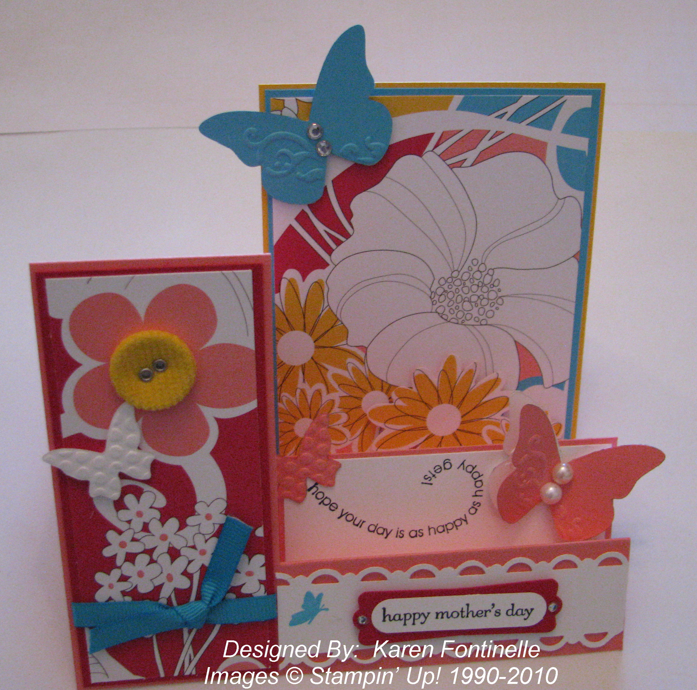 This was my first attempt at a "stair step" card, and it was very easy to make. (If I could find the measurements I used I would post them! Maybe later!) All you really do is fold your card stock in a series of accordion folds. If you want the side panel like I have on this card, you cut a slit to separate it from the rest of the folds. Then you just add whatever fanciness you want to each stair step! On this card I used the Pink Flamingo Designer Series Paper #113976 and the Stampin' Up! Beautiful Wings Embosslit Die #118138 to make the butterflies.