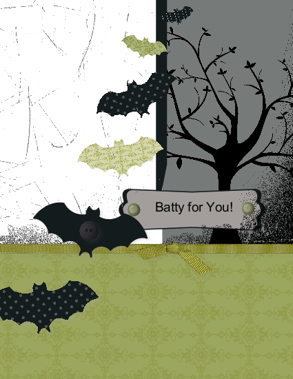Part of the fun of My Digital Studio projects is that they literally only take minutes to make…..OR you can work for hours on one if you want to. In this case, I just used a designer card for Halloween already made up, but changed a few things. I added the sentiment on the front, the brads and the tree in the background. Very easy!