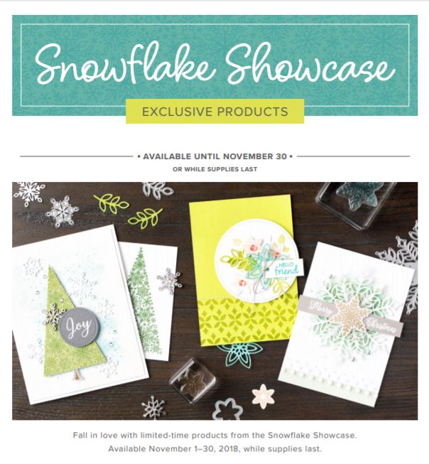 Coming soon! The Snowflake Showcase is coming November 1, 2018 through November 30, while supplies last! The Snowflake Showcase is a suite of products with which you can make beautiful winter and holiday cards and projects – just in case you didn’t see enough beautiful products in the Holiday Catalog to tempt you!
