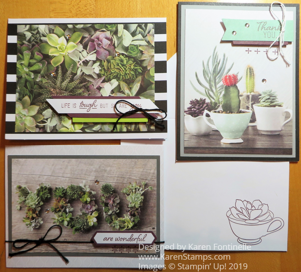 The Stampin’ Up! Paper Pumpkin design team actually went out and purchased succulents, then brought them back to the office and photographed them. This is how the photographic images on the front of the cards came about. I think it makes the cards even more interesting to know how they were created! But I always like “behind the scenes” stories!