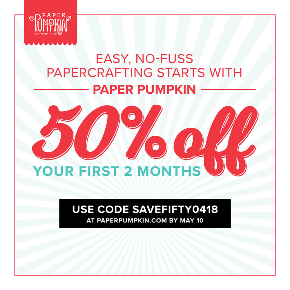 If you are a new Paper Pumpkin subscriber and sign up by April 10th or May 10th, you can save 50% off the first two months of kits! That is a tremendous bargain for all you get in each kit! You get a clear block with your first kit when you are new so you can mount the stamps. Each kit includes an exclusive stamp set, an ink spot (a very small ink pad!), instructions (of course!), link to a video, and all the supplies you need to assemble the project! You can follow the directions exactly or change up the design if you like! And no risk, no obligation!