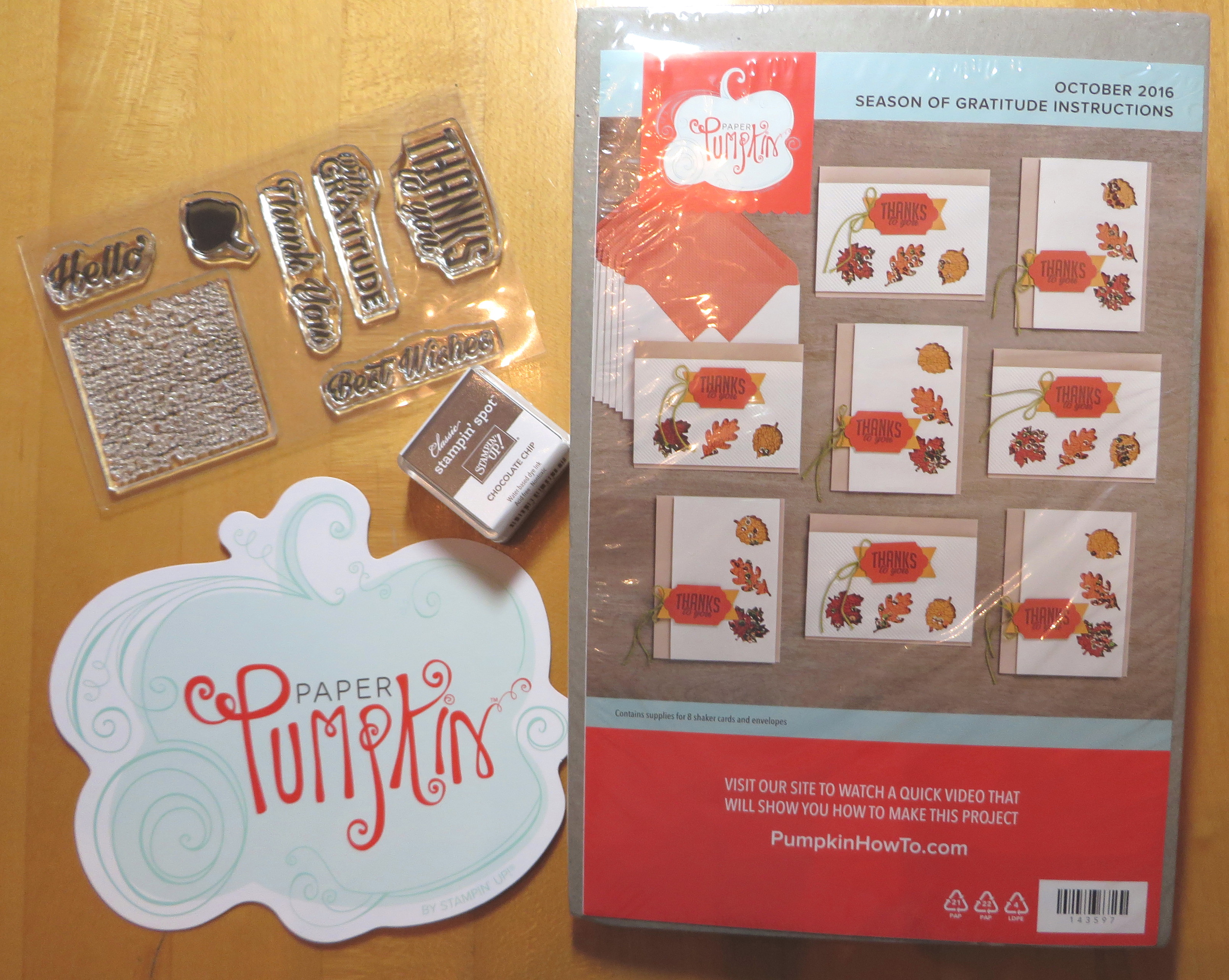 What is Paper Pumpkin? It’s a crafting kit from Stampin’ Up! that comes in your mailbox once a month with a surprise project inside. Might be cards, might be a treat bag, might be an album, might be a decor item – you never know! I’ve heard some people don’t like surprises, but why not live dangerously?? It’s only stamps, ink and paper! And you do get an exclusive photopolymer stamp set inside every kit plus a small ink spot and all the supplies plus directions for making your kit. And every month there is a video from Stampin’ Up! to watch as well if you want a little more direction. (It does help!) You can follow the directions exactly or come up with your own project. There are no Paper Pumpkin Police checking if you made the project they sent! Surely you deserve a few minutes of crafting time for yourself!