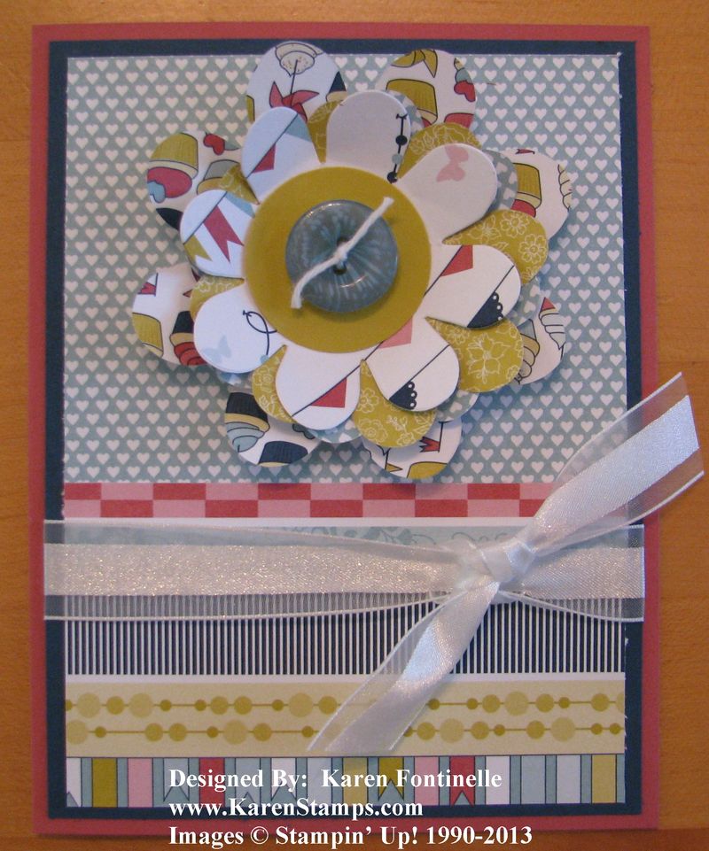 I loved making a flower with the Flower Folds Die and the Big Shot out of several different patterns of the paper. Maybe a real flower wouldn’t have the lines of a banner going across it, but I liked the colorful look.