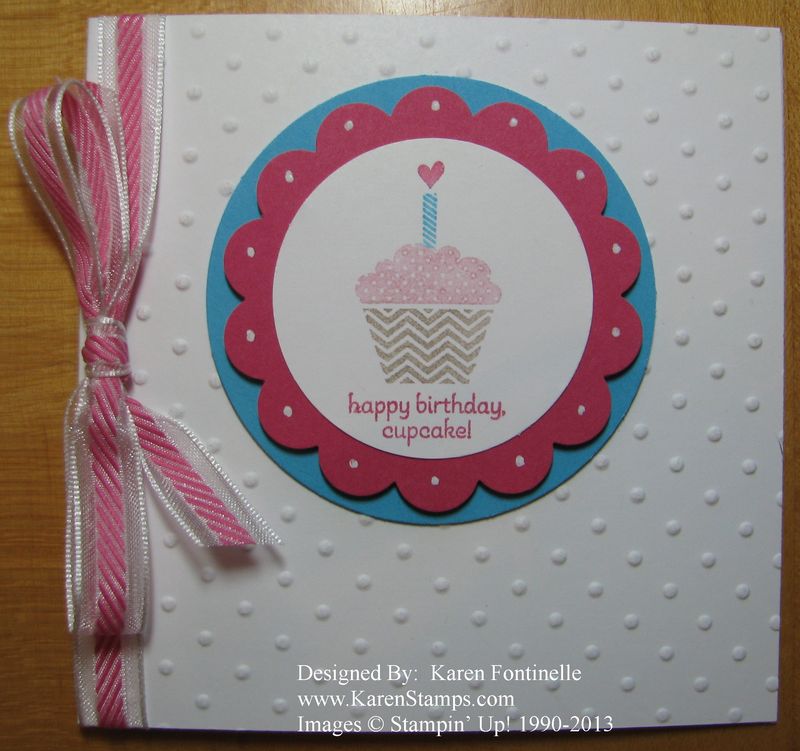 Here’s another sample of a card using the Sale-A-Bration stamp set Patterned Occasions. I found this polka-dot embossed card base in my “scraps” and I decided it would be perfect to use with the cute little cupcake in the Patterned Occasions stamp set. I could have stamped the cupcake in just one color and it would have been nice. To get the different colors on the one stamp, I used our Stampin’ Write Markers to color in the stamp. Then it is punched out with the 1 3/4″ Circle Punch and layered on the 2 3/8″ Scallop Circle Punch. That is popped up on the 2 1/2″ Circle Punch with Stampin’ Dimensionals. The pretty new ribbon is found in the Spring Catalog on page 30, Melon Mambo 3/8″ Striped Organdy Ribbon.
