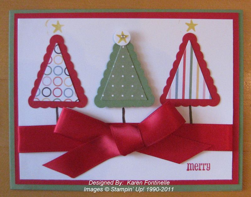 The new Pennant Parade stamp set and the Petite Pennants Builder Punch are both so versatile you've got to have them! On this card I used the punch to make the trees plus our new Just Add Cake Designer Series Paper and card stock. I could have stamped images from the Pennant Parade stamp set and punched them out, also. The word Merry and the star are from the stamp set.