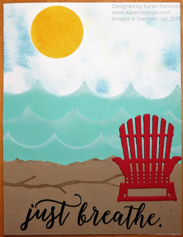The greeting from the same stamp set is stamped in Crumb Cake ink. What a great saying, because the best way to relax is to “Just Breathe.” And there’s no better place to take in fresh air than at the ocean. The chair is die cut with the Seasonal Layers dies in Real Red. I LOVE this die cut chair, especially in red!