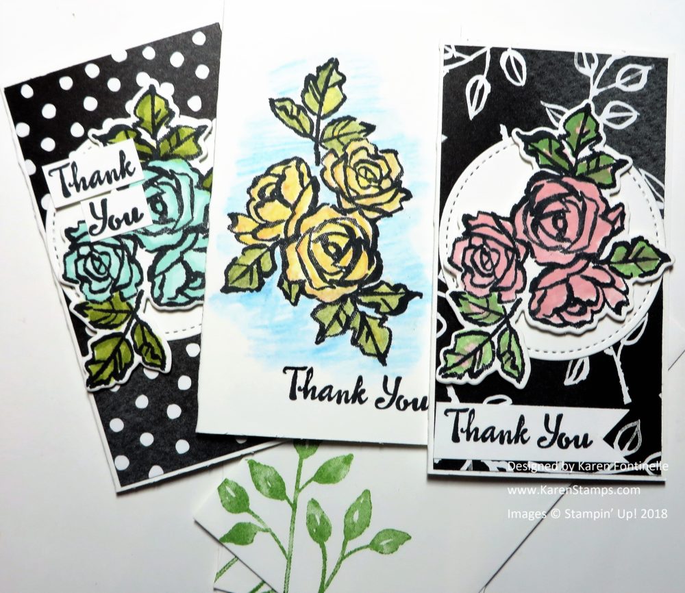 These Narrow Note Cards and Envelopes are just the right size for some stamping fun! I used a sample in the catalog for inspiration (that means to copy!) I cut a piece of the Petal Passion Designer Paper just a tiny bit smaller than the note card to layer on top. Then I stamped some flowers from the Petal Palette Stamp Set, colored them in, and die cut with the Petals & More Thinlits Dies. I also die cut a Whisper White circle with the Stitched Shapes Framelits Dies for a background for the flowers. The flowers on the note cards on the left and rght are popped up on Stampin’ Dimensionals.