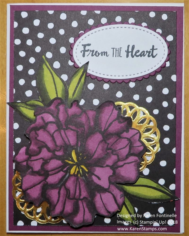I had actually already colored this flower on one of the patterns from the Petal Passion Designer Series Paper awhile back. I used the Stampin’ Blends markers, which unfortunately are not available right now, but hopefully will return maybe in June. You don’t have to have those markers to duplicate this card, though, just use another coloring technique such as the Watercolor Pencils, ink pad and Sponge Daubers, ink refills and Aqua Painter. You can read the post about my coloring therapy with this paper HERE.