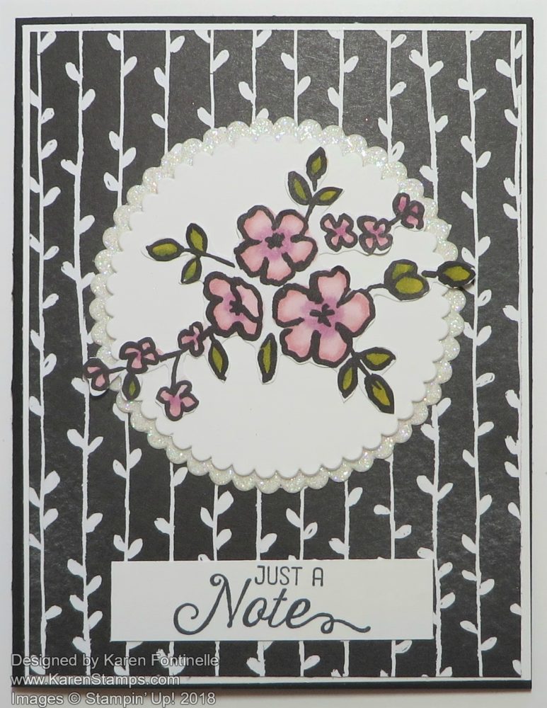 I have to admit, the Petal Passion Designer Series Paper was not at the top of my list when the last catalog came out, but I have loved using it as you see on this Petal Passion Just a Note Card. You can use it as it comes, in plain black and white, or you can do so coloring in, particularly on certain patterns of the paper.