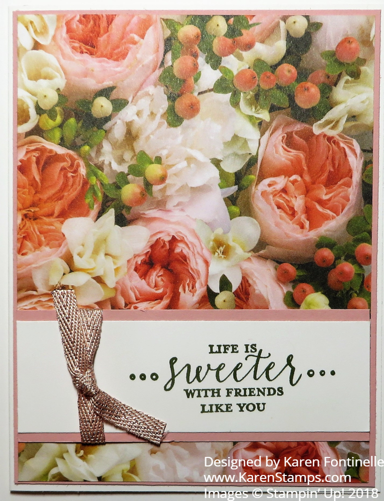Yes, the Petal Promenade Designer Series Paper really is that beautiful! You can make easy cards with this paper because it is so pretty that it stands on its own. You don’t need to add too much embellishment or it will be too much. I just got this paper late Friday night (where was that UPS man??!) and couldn’t wait to open the package. As I explained in THIS POST, this paper was made from actually photographing real flowers and then turning it into designer paper by the Stampin’ Up! artists!