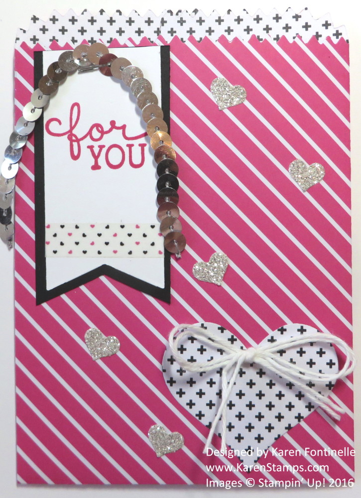 I made the bag with the diagonal stripe pattern from the Pop of Pink paper and die cut a heart out of the same paper but turned it over on the other side. I die cut a banner, but cut off the one end so it would be straight and cut a slightly larger piece of Basic Black as a layer underneath the Whisper White banner. The greeting on the banner is from the Birthday Blooms Stamp Set. For a little interest I added a strip of Pop of Pink Designer Washi Tape. I attached a piece of the Silver Sequin Trim with the Handheld Stapler. (Love this stapler by the way!) I die cut the strip of hearts from the Dazzling Diamonds Glimmer Paper and used the individual hearts for some embellishments and pizzazz. And for a little something on the Pop of Pink heart, I took two strands of Whisper White Solid Baker’s Twine to make a bow and adhered with a rolled up Glue Dot.