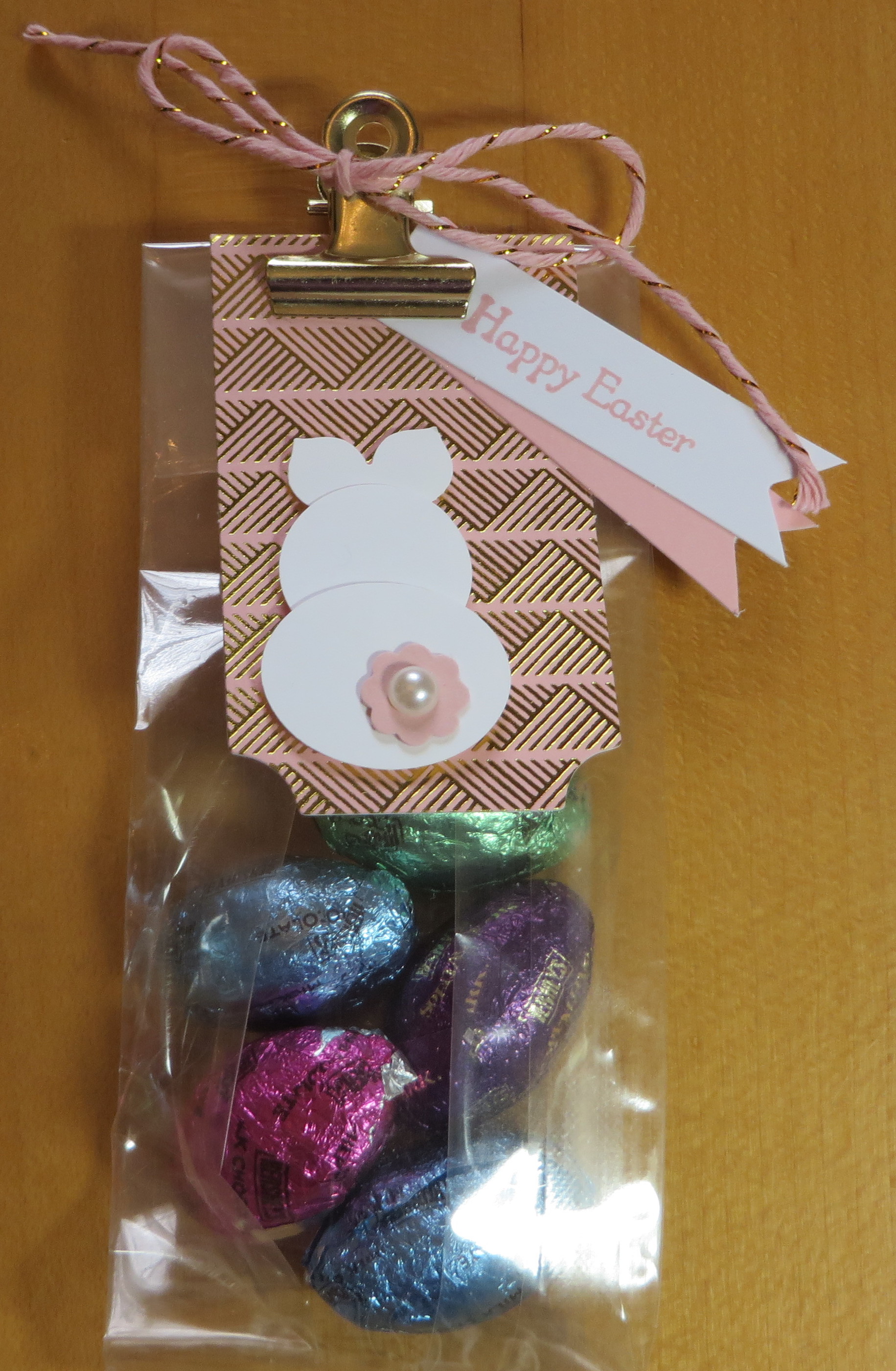 If you don’t use up all the materials in your monthly Paper Pumpkin Kit, just save them and you might come up with alternate ideas in the future. Here I used extra supplies from my February Paper Pumpkin Kit to make an Easter treat! The kit contained these cello bags, the foldover tags for the bag topper, the cute clip, the pretty pink and gold baker’s twine, and the little banner tags. I stamped the Easter greeting with a stamp from Teeny Tiny Wishes (a must have word stamp set in my opinion!).