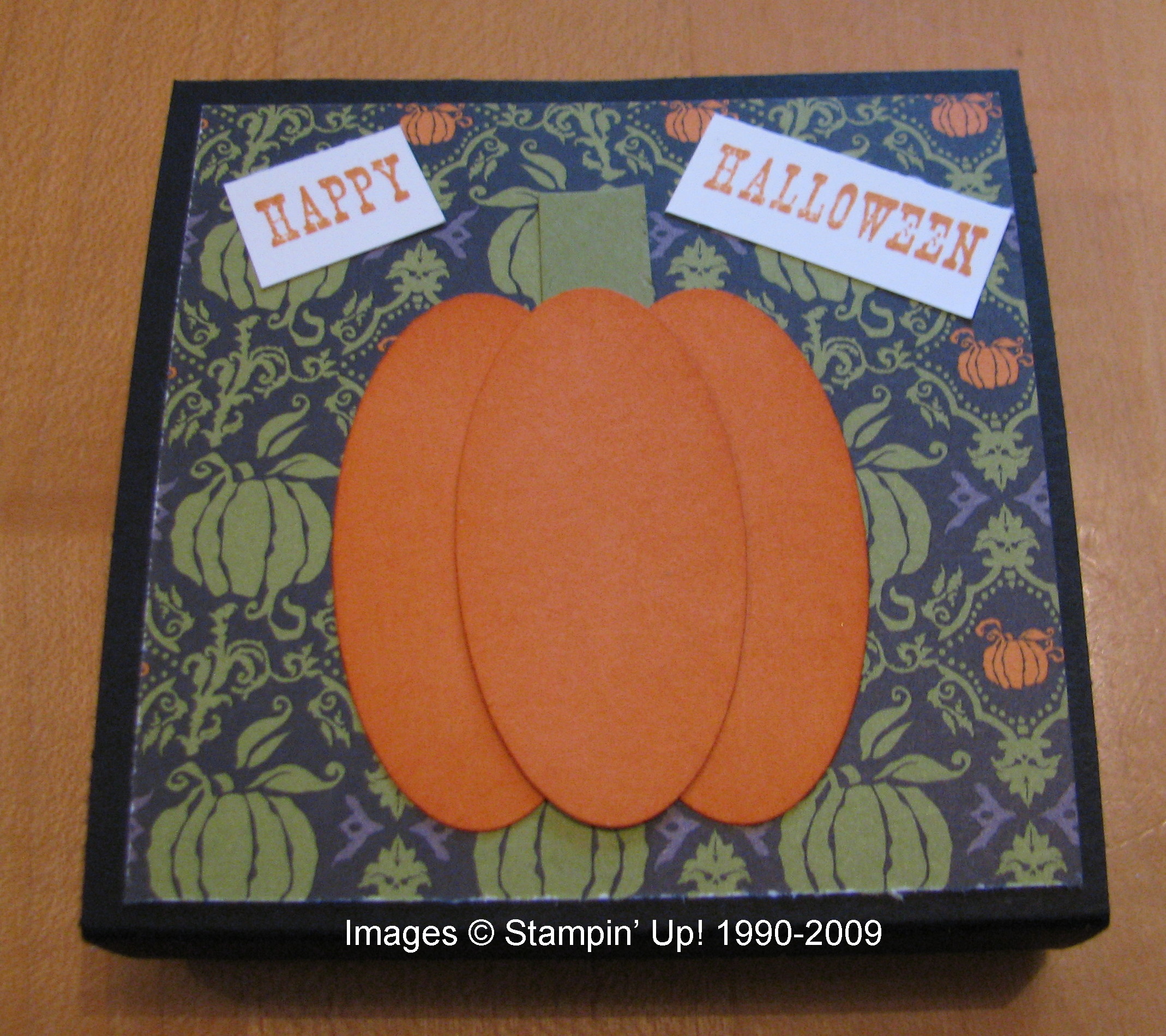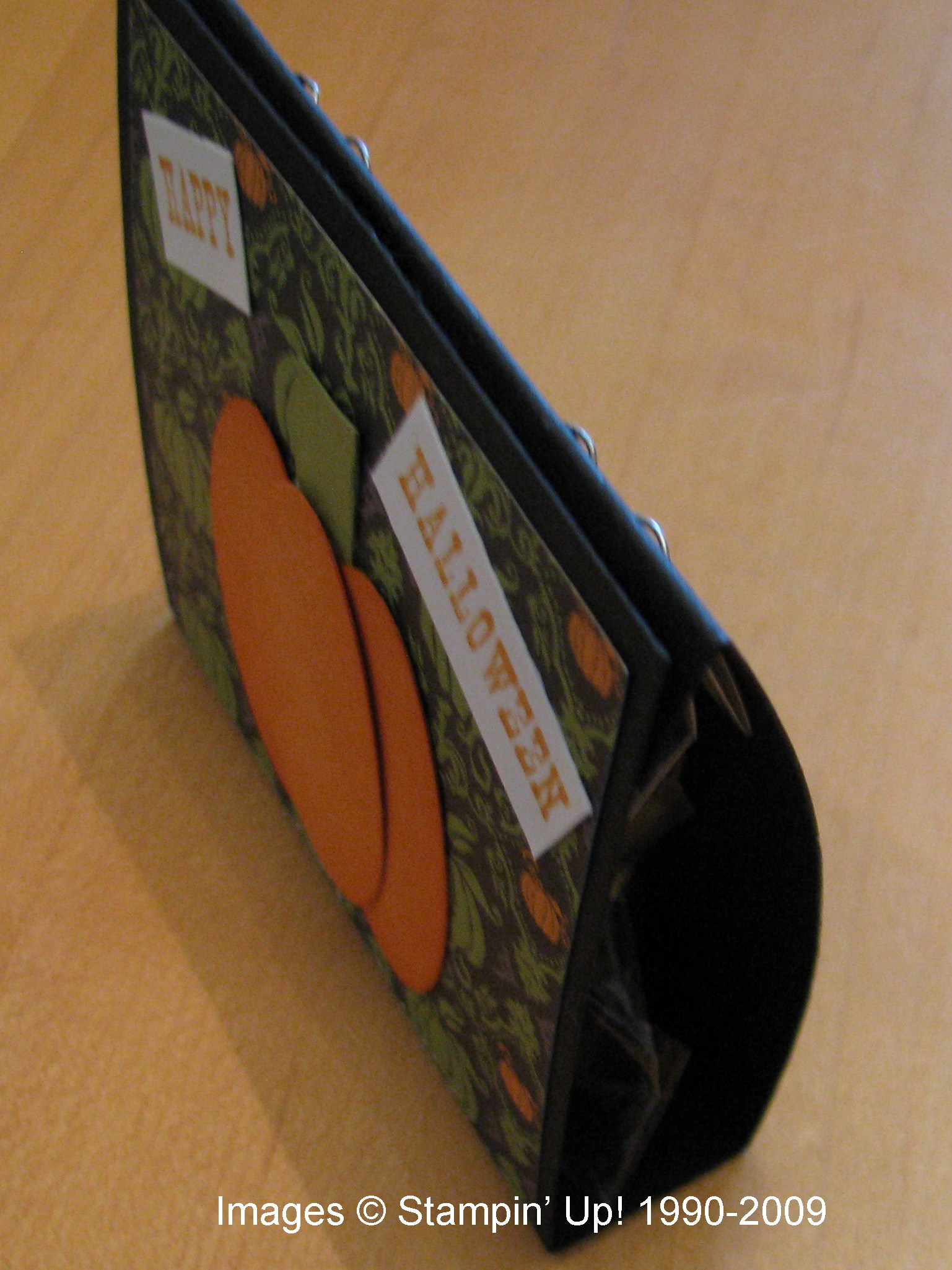 The black card stock is 3 1/4" x 7 1/4", scored at 1/2", 3 1/2", and 4 1/4". On the front I used a small piece of Cast-A-Spell Designer Series Paper and made my pumpkin from three oval punches, sponged a little on the sides. The candy corn is in a little Stampin' Up! cello bag, stapled to the back, although you could also just use SNAIL. To keep the holder closed, I put a dab of Tombow Multipurpose Adhesive on the two ends and let dry. Now it is a temporary adhesive that I can open and close carefully. You could also punch some holes and use ribbon. The sentiment is from "All Holidays" stamp set.