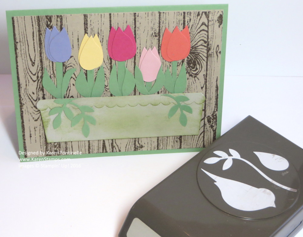 I was simply going to make a card for spring using the Bird Builder Punch to make punch art tulips. All you have to do is punch three of the leaves and layer them to look like tulips! As I started making the tulips and placing them on a Whisper White background, I somehow came up with this idea, tulips in a window box perhaps hanging on a wooden fence!