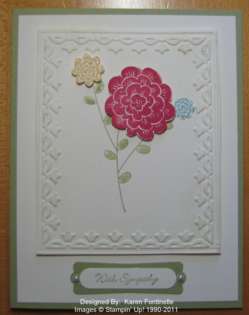 Raining Flowers is one of the several free stamp sets we received in our bags at the Stampin' Up! Convention this past summer. While doing some other stamping project, I learned how to make a smaller panel embossed with the Framed Tulips Textured Impressions Embossing Folder Die #121809 and decided to use it on this card. I like the white on white look of layers, or in this case, Very Vanilla layered on top of Very Vanilla. The frame is popped up on Stampin' Dimensionals and sponged just the tiniest bit with some Pear Pizzazz ink. I just stamped some Raining Flowers in the middle, cut out and popped up the Rose Red flower and the So Saffron flower. The flowers are actually stamped and then punched with a smaller punch that doesn't really match the shape of the stamp, but it looks fine. It was fun to experiment with something new!