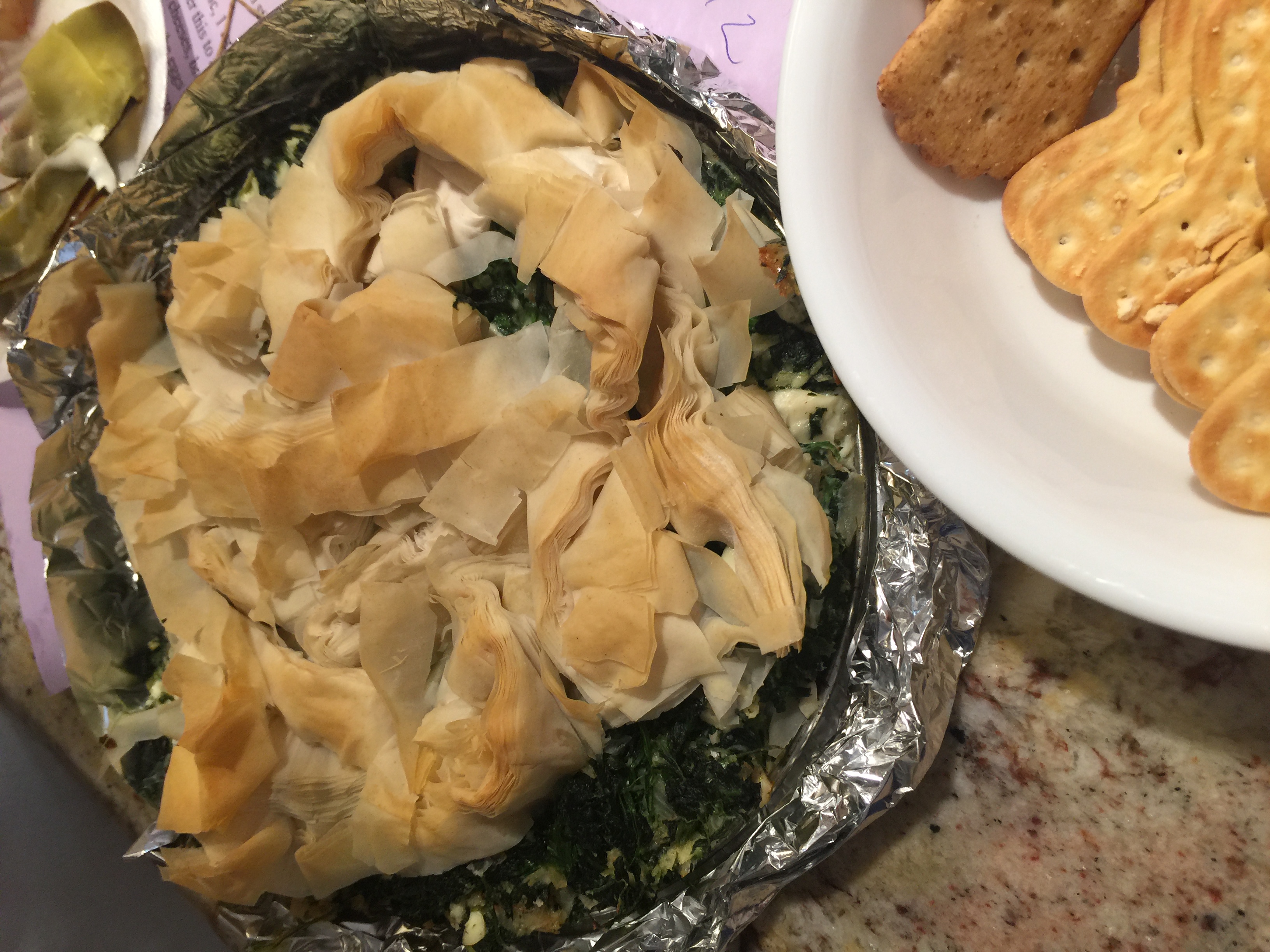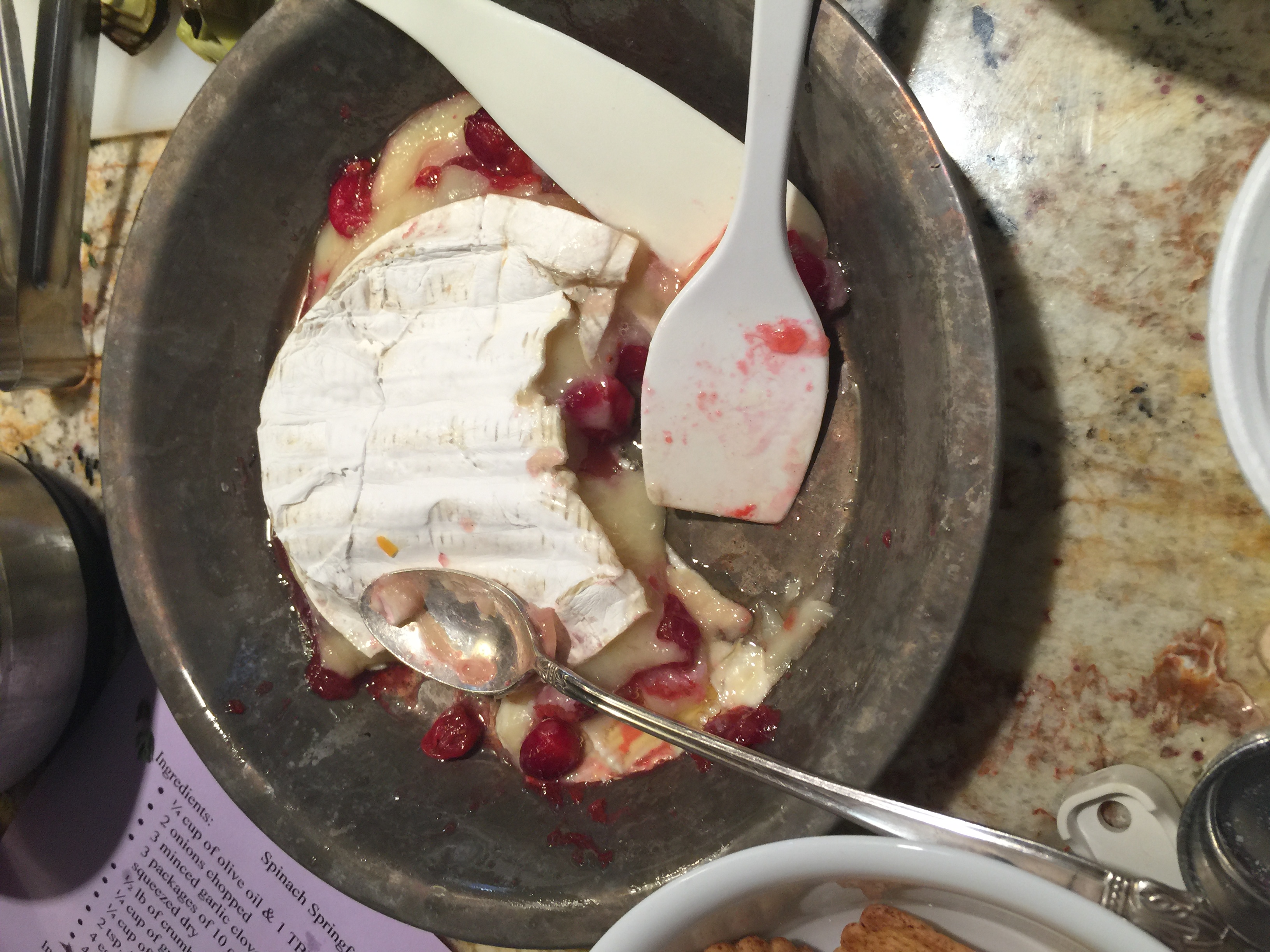 What fun and what delicious food she showed us how to cook, some of which we cooked ourselves! It was a lot of balls in the air at one time, but she pulled it off and we had so many samples to try and some to take home that I’m not sure I can even remember what all we made! I wasn’t taking photos with the intention to post on my blog, just to help remember the things we made, so they are “real” photos, nothing staged! The photo below is a brie wheel with a delicious sauce of cranberries and pears in a sugar syrup. Yum! The first photo above is spinach with a phyllo dough topping.
