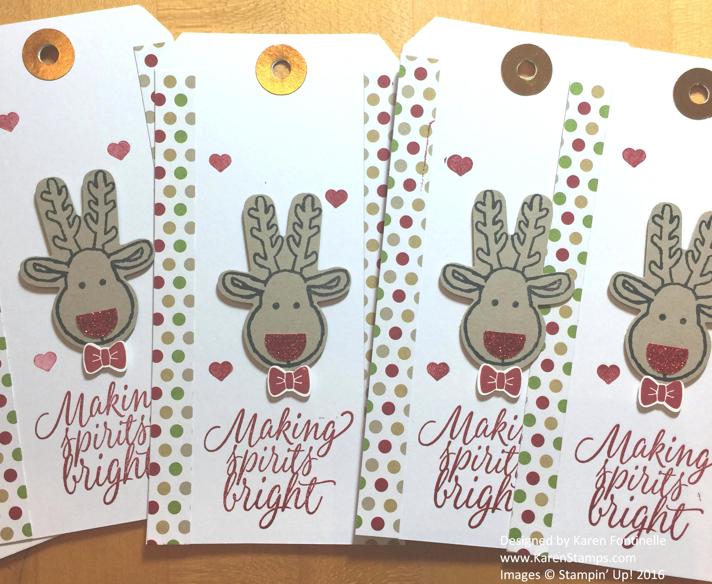 What a fun day I had yesterday! In the afternoon one of my customers, who has become a dear friend to me, and her little girl came over and we made these Reindeer Christmas Gift Tags for a children’s group for their stockings. Since we were making 24 tags and for both boys and girls, we needed something relatively easy to make, something that appeals to either a boy or a girl, and something for different ages.