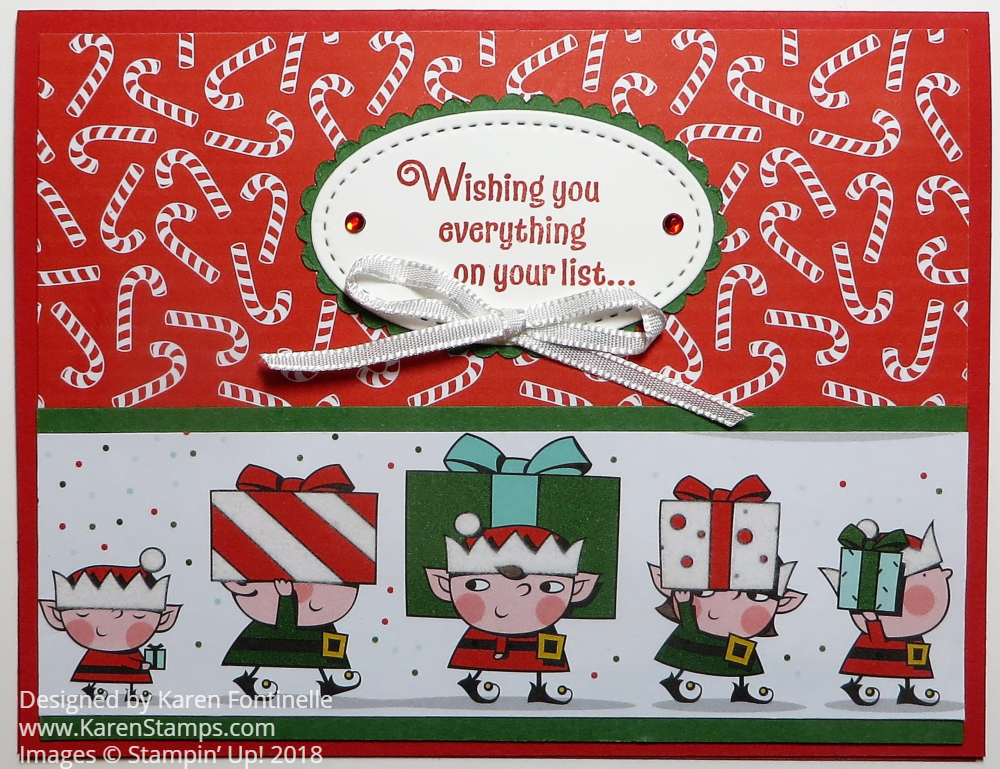 This card starts with Poppy Parade Cardstock for the card base. You might wonder about Poppy Parade for a Christmas card, but it works! I cut just this little strip of elves carrying packages out of one of the sheets and placed it at the bottom of the card, layered on a piece of Garden Green Cardstock. The candy cane paper is actually the opposite side of the elves paper.