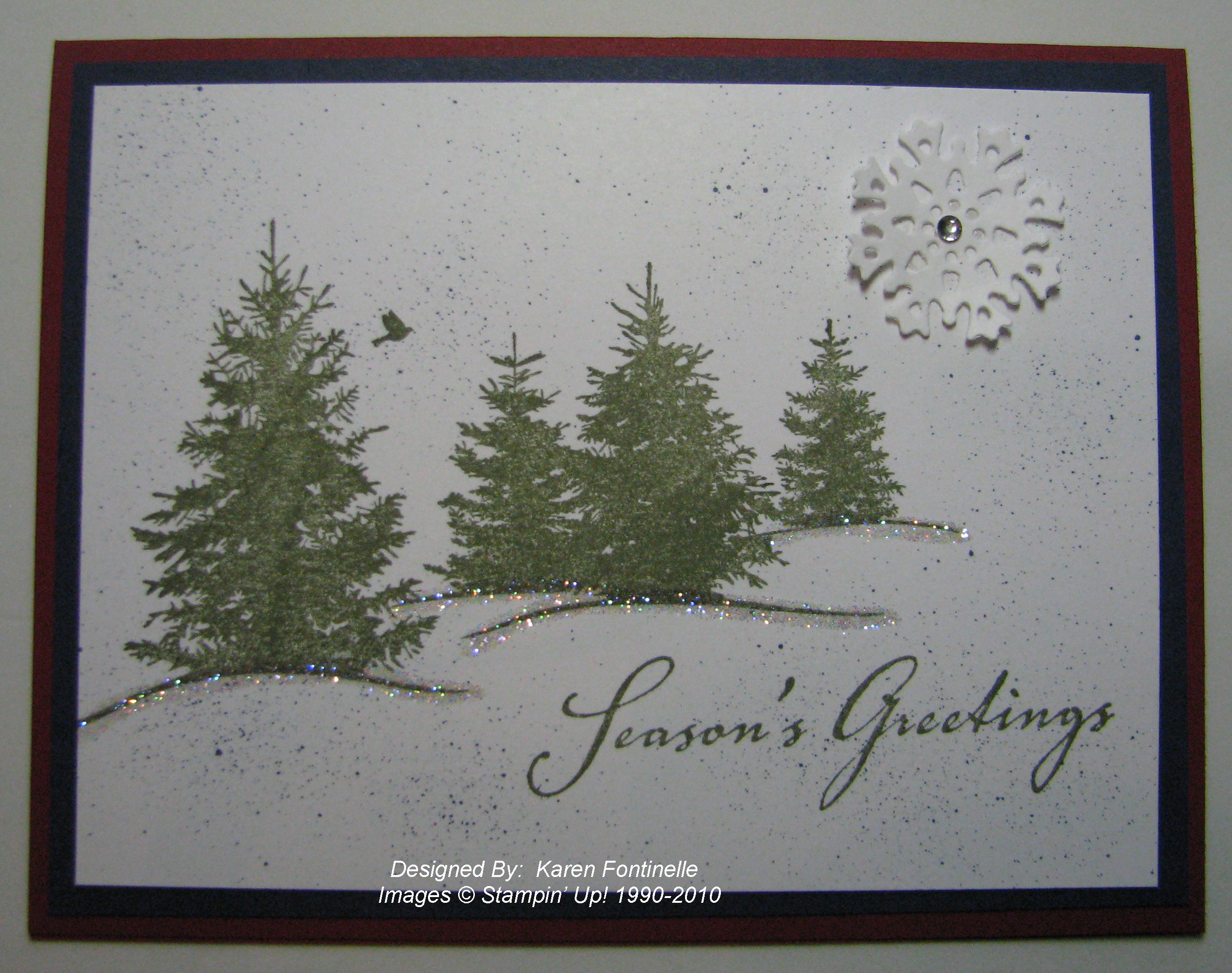 This is a beautiful stamp set, Scenic Season #115354, from the Stampin' Up! 2010-2011 Idea Book & Catalog, page 36, that allows you to make an easy and elegant Christmas card. Just stamp the trees and a greeting, add a little Dazzling Diamonds Glitter and maybe a snowflake from the die cut Northern Frost #120901 in the corner. Layer on whatever cardstock colors you select. I used Night of Navy and Cherry Cobbler.