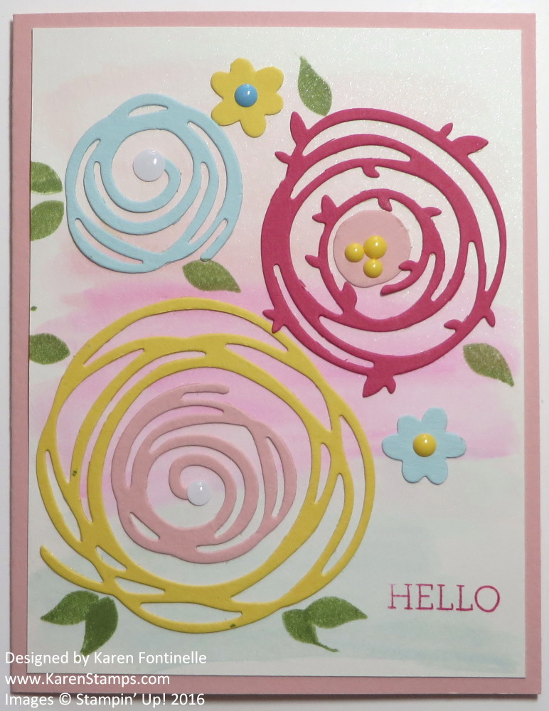 It was time to play with the Swirly Scribbles Thinlits Dies and make some Swirly Scribbles Flowers on a watercolored background. Once you cut out the flower pieces with the Big Shot, just glue them down with tiny dots of Multipurpose Liquid Glue or the Fine Tip Glue Pen. Then add any greeting you like for the occasion and any embellishments. I like to cut out extra scribbles to use another time.