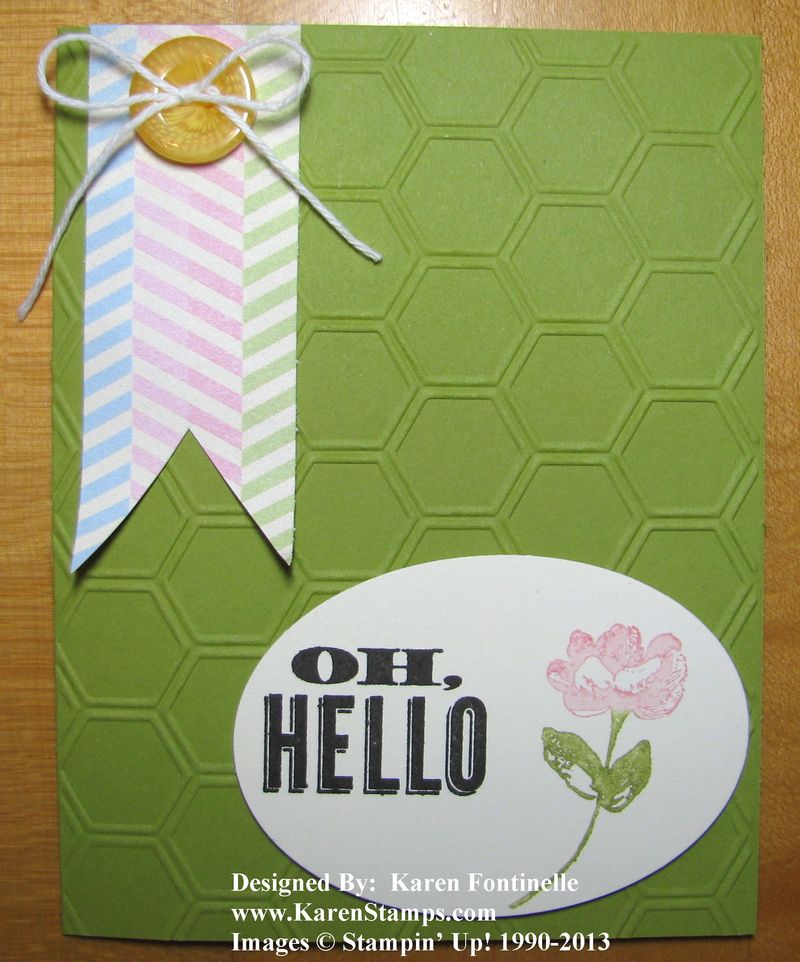 The Stampin’ Up! Spring Catalog stamp set “Oh Hello” is just perfect for this type of card! It’s easy to use and create with, especially if you have the coordinating designer series paper, Tea for Two. You can even purchase the stamp set and the Oval Framelits in a bundle and save 15%!