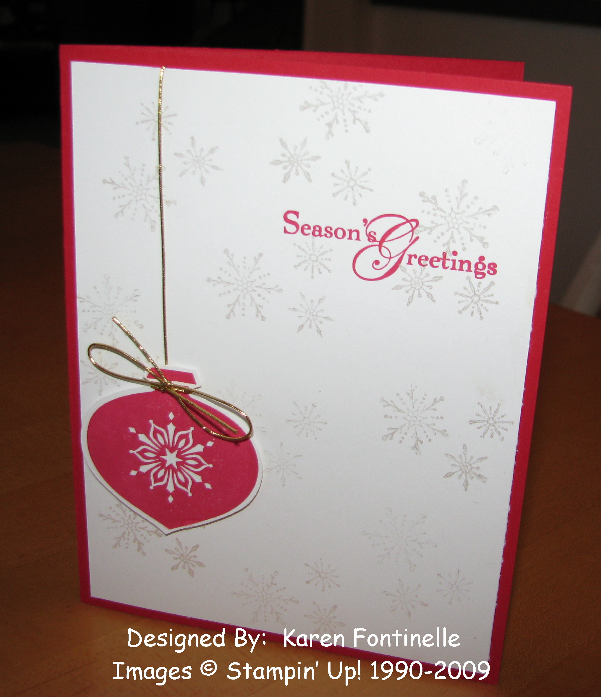 Here's an easy card I made stamping the snowflakes in the background with the Shimmer Paint. They're very light and yet they add some beautiful interest to the card. I think they show up pretty well in this photo for you to see!