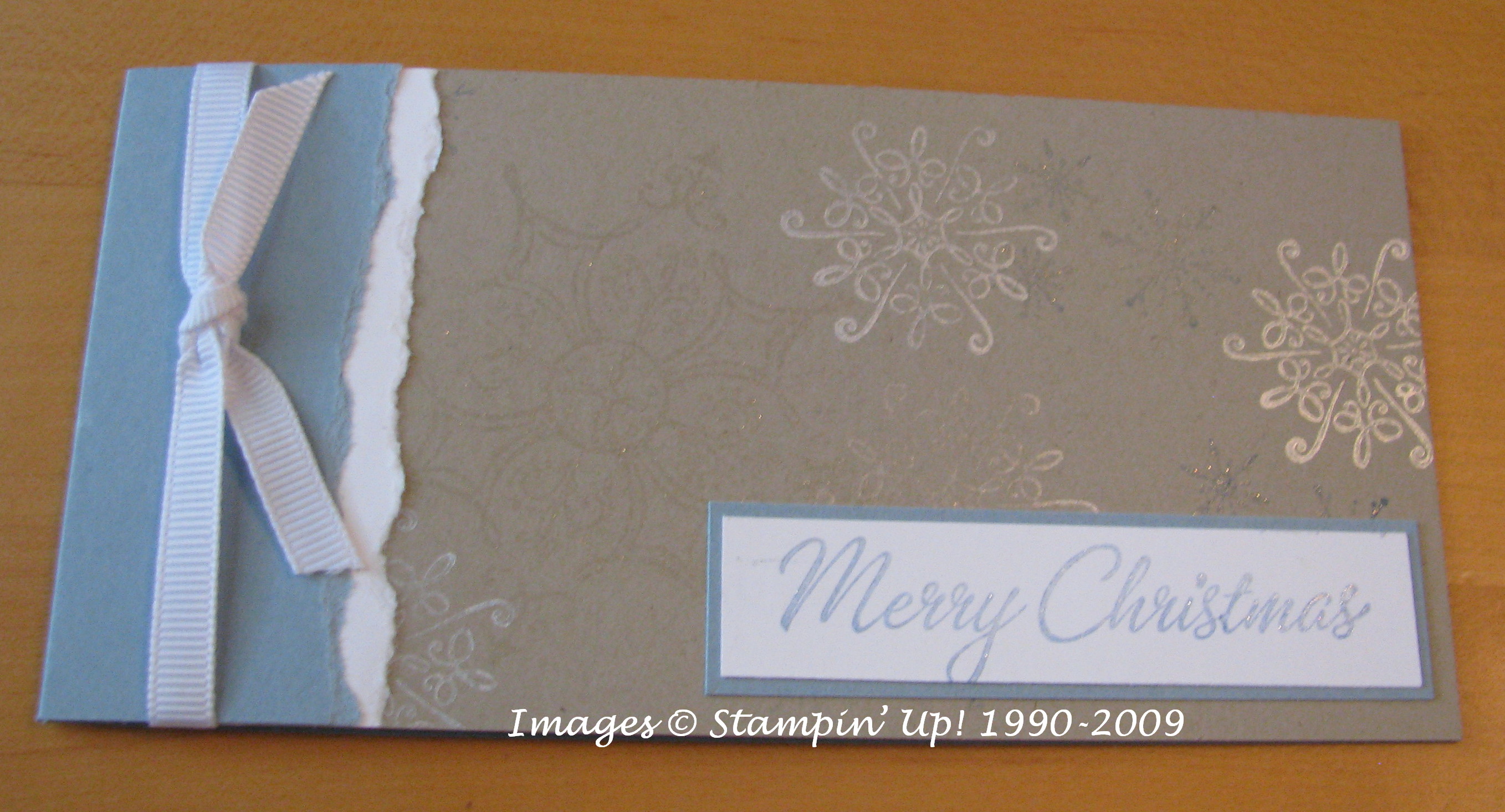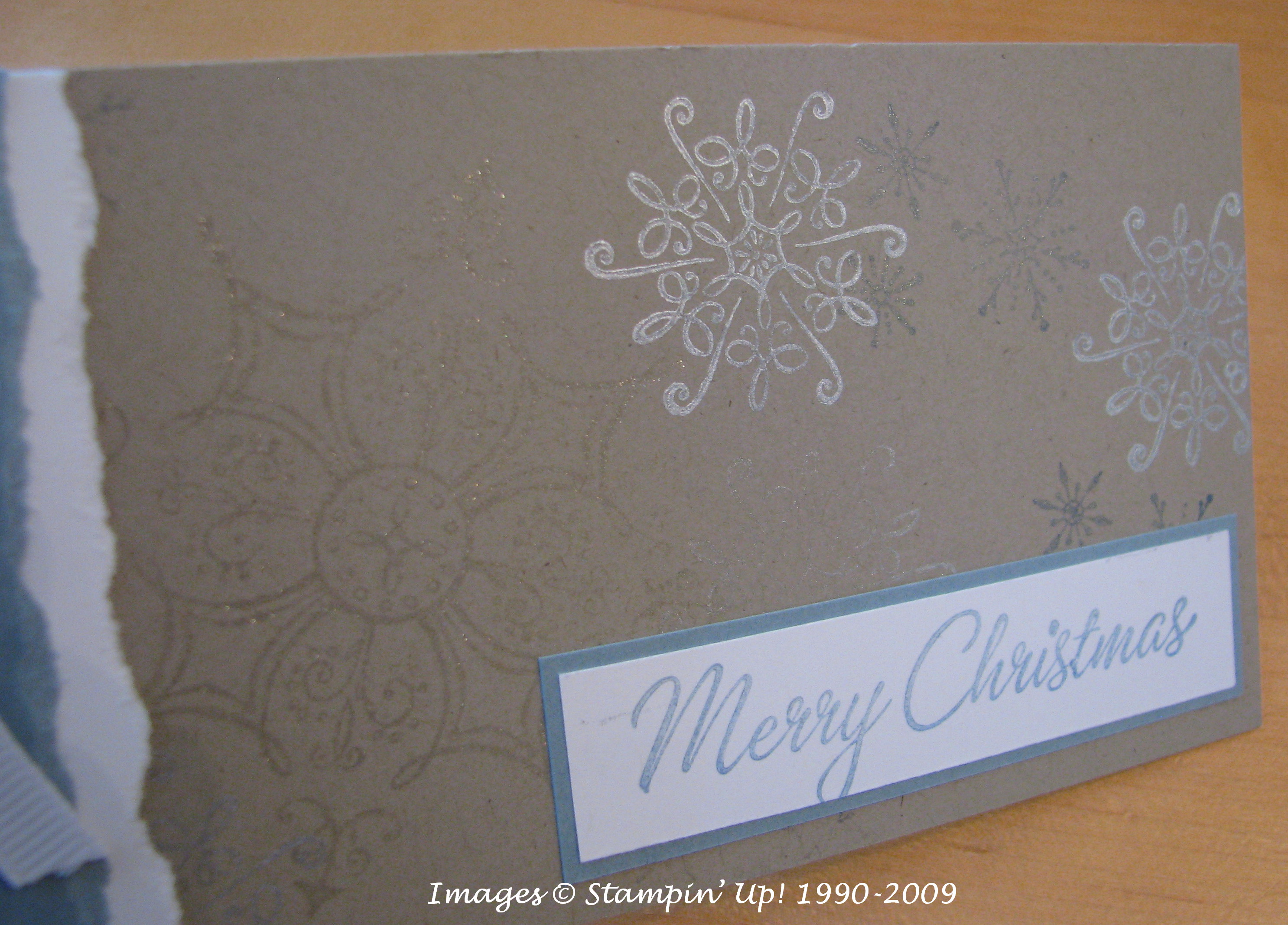 Another "copy" of a card in the Holiday Mini……..I just love the picture on page 26 of the Holiday Mini of the "Snow" scrapbook page, a "Season's Greetings" card and a little box. I wanted to try out the beautiful "Serene Snowflakes" stamp set along with the new Shimmer Paint. The Shimmer Paint (page 27 Holiday Mini) is easy to use….just shake the bottle and in most cases just use the little bit of paint inside the lid, picking up with a sponge dauber or paintbrush. You can ink up your stamp, then apply the Shimmer Paint to the stamp right over the ink and then stamp…..OR just apply the Shimmer Paint directly to the stamp and stamp. There are three colors of Shimmer Paint available and I may have tried them all out on this card! You can't detect the "shimmer" on the card but I think you can see how the look of the snowflakes change as you move the card. You should be able to click on the photos to make them larger. The Shimmer Paint is just something fun to give a subtle, elegant look to your projects!