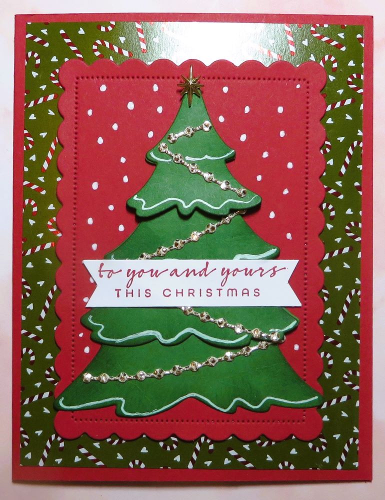 My main idea was to make a Christmas tree using the Merriest Trees Dies with all the different sizes that you can either have for separate trees or layer them all together and make it a little like a 3D tree, especially if you kind of curl the bottom edges of the layers. To help it stand out from the background paper of small candy canes on a dark Mossy Meadow green background, I used the Scalloped Contours Dies to make this Real Red background scalloped rectangle behind the tree.