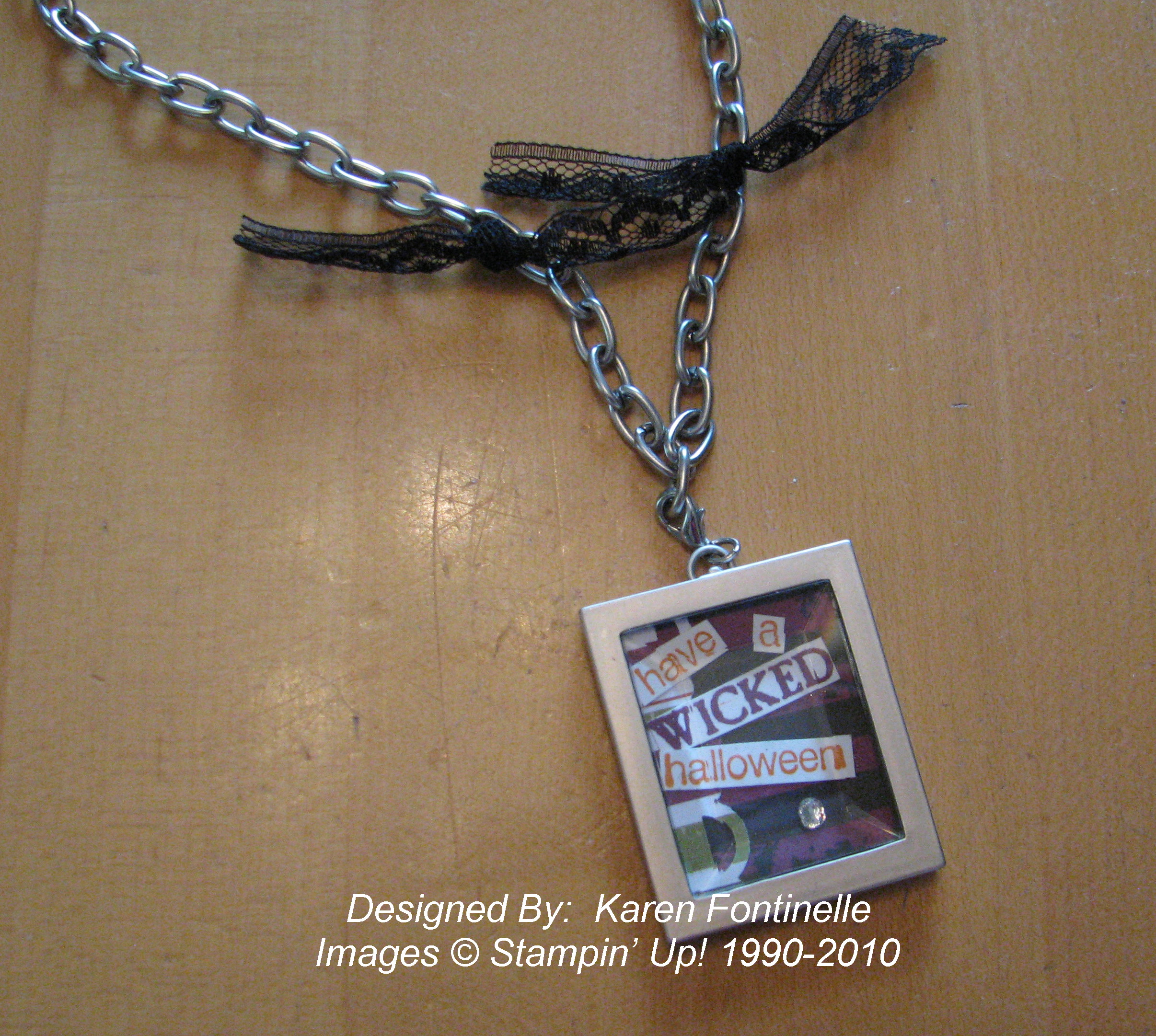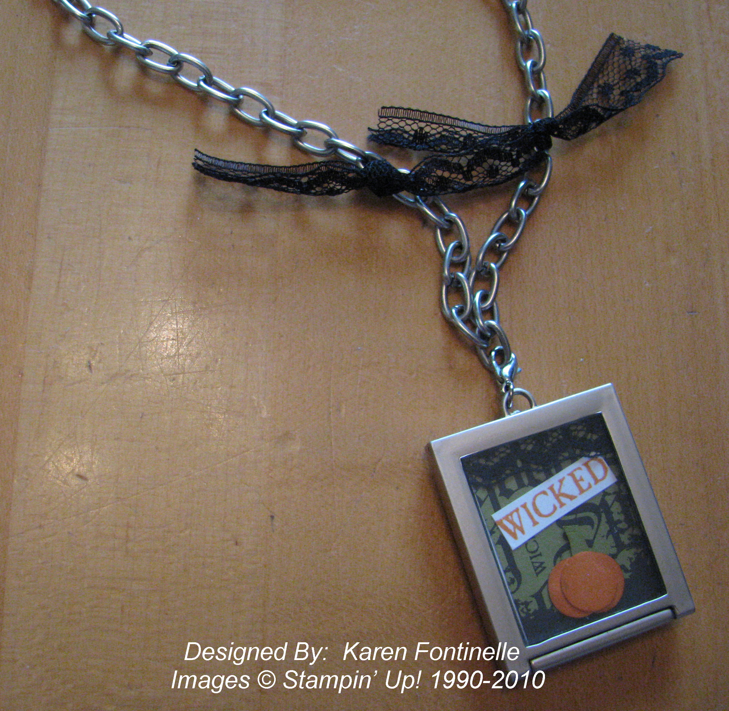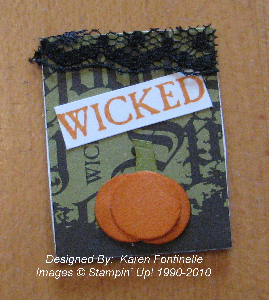 Here are the inserts alone. I used some Wicked Fun Specialty Paper #117400, stamped a sentiment in the stamp set Wicked Cool #120600(clear) and cut it apart, punched a strip with the Scallop Trim Border Punch #118402, added a little Rhinestone #119246 and also a snippet of the Raven 1/2" Lace Trim #120988. The tiny pumpkin is made from three circles punched from the cute little punch in the Itty bitty Shapes Punch Pack #118309. (You've gotta have these punches! They are so itty bitty and cute!!) The tiny green stem doesn't show up against the DSP in the background. You can see I also tied on some bits of the Raven Lace Trim right onto the necklace chain.