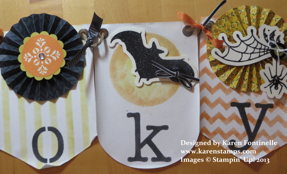 One thing I easily passed up in the Holiday Catalog was this Build a Banner Simply Created Kit. But after seeing several banners created at the Stampin Up! Convention this summer, it was one of the first things to go on my next order! The Build a Banner Kit has the canvas pennants with grommets and all the stencils. All you need to do is decorate it! To make that easy for you, purchase the Halloween Banner Simply Created Accessory Kit and you’ll have everything you need!